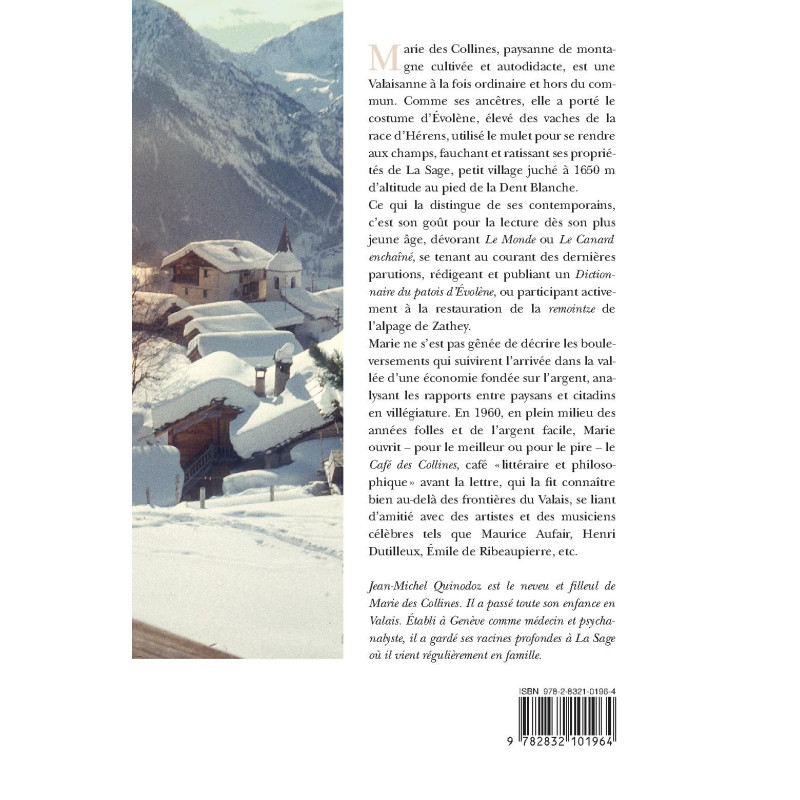 Marie des Collines, paysanne de montagne cultivée et autodidacte, est une Valaisanne à la fois ordinaire et hors du commun. Comme ses ancêtres, elle a porté le costume d`Évolène, élevé des vaches de la race d`Hérens, utilisé le mulet pour se rendre au champs, fauchant et ratissant ses propriétés de La Sage, petit village juché à 1650 mètres d`altitude au pied de la Dent Blanche. Ce qui la distingue de ses contemporains, c`est son goût pour la lecture dès son plus jeu âge, dévorant Le Monde ou Le Canard enchaîné, se tenant au courant des dernières parutions, rédigeant et publiant un Dictionnaire du patois d`Évolène, ou participant activement à la restauration de la remointze de l`alpage de Zathey. Marie ne s`est pas gênée de décrire les bouleversements qui suivirent l`arrivée dans la vallée d`une économie fondée sur l`argent, analysant les rapports entre paysans et citadins en villégiature. En 1960, en plein milieu des années folles et de l`argent facile, Marie ouvrit - pour le meilleur ou pour le pire - le Café des Collines, café " littéraire et philosophique " avant la lettre, qui la fit connaître bien au-delà des frontières du Valais, se liant d`amitié avec des artistes et des musiciens célèbres tels que Maurice Aufair, Henri Dutilleux, Émile de Ribeaupierre, etc.