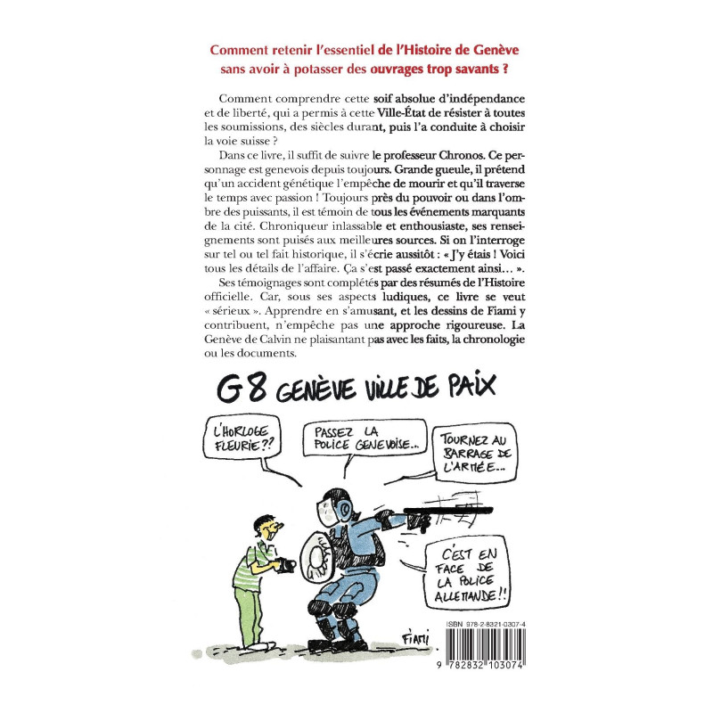 Sans avoir à potasser des ouvrages trop savants ? Comment comprendre cette soif absolue d'indépendance et de liberté, qui a permis à cette Ville-État de résister à toutes les soumissions, des siècles durant, puis l'a conduite à choisir la voie suisse ? Dans ce livre, il suffit de suivre le professeur Chronos. Ce personnage est Genevois depuis toujours. Grande gueule, il prétend qu'un accident génétique l'empêche de mourir et qu'il traverse le temps avec passion ! Toujours près du pouvoir ou dans l'ombre des puissants, il est témoin de tous les événements marquants de la cité. Chroniqueur inlassable et enthousiaste, ses renseignements sont puisés aux meilleures sources. Si on l'interroge sur tel ou tel fait historique, il s'écrie aussitôt : " J'y étais ! Voici tous les détails de l'affaire. Ça s'est passé exactement ainsi… " Ses témoignages sont complétés par des résumés de l'Histoire officielle. Car sous ses aspects ludiques, ce livre se veut " sérieux ". Apprendre en s'amusant, et les dessins de Fiami y contribuent, n'empêche pas une approche rigoureuse. La Genève de Calvin ne plaisantant pas avec les faits, la chronologie ou les documents.