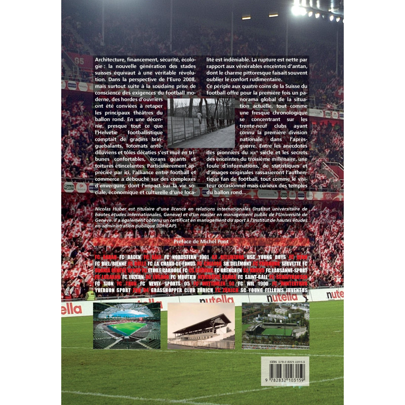 Architecture, financement, sécurité, écologie : la nouvelle génération des stades suisses équivaut à une véritable révolution. Dans la perspective de l'Euro 2008, mais surtout suite à la soudaine prise de conscience des exigences du football moderne, des hordes d'ouvriers ont été conviées à retaper les principaux théâtres du ballon rond. En une décennie, presque tout ce que l'Helvétie footballistique comptait de gradins bringuebalants, Totomats antédiluviens et tôles décaties s'est mué en tribunes confortables, écrans géants et toitures étincelantes. Particulièrement appréciée par ici, l'alliance entre football et commerce a débouché sur des complexes d'envergure, dont l'impact sur la vie sociale, économique et culturelle d'une localité est indéniable. La rupture est nette par rapport aux vénérables enceintes d'antan, dont le charme pittoresque faisait souvent oublier le confort rudimentaire. Ce périple aux quatre coins de la Suisse du football offre pour la première fois un panorama global de la situation actuelle, tout comme une fresque chronologique se concentrant sur les trente-neuf clubs ayant connu la première division nationale dans l'après-guerre. Entre les anecdotes des pionniers du XIXe siècle et les secrets des enceintes du troisième millénaire, une foule d'informations, de statistiques et d'images originales rassasieront l'authentique fan de football, tout comme le visiteur occasionnel mais curieux des temples du ballon rond...