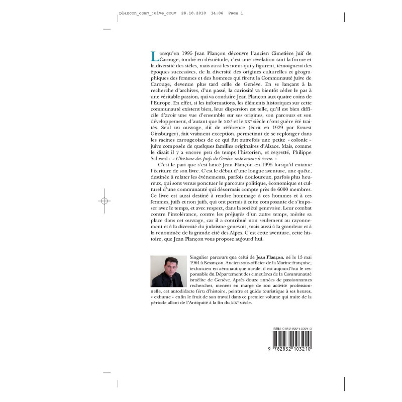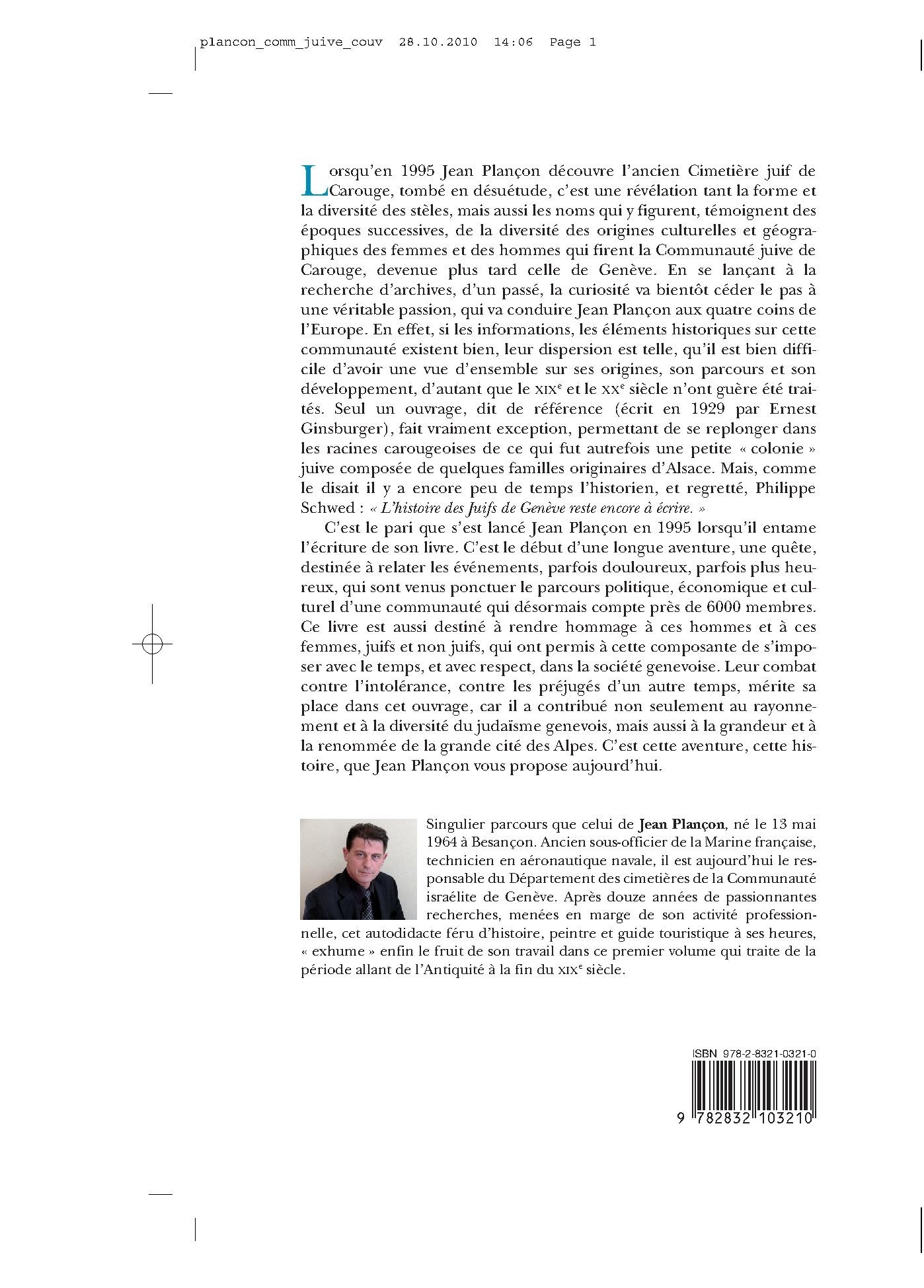 Lorsqu'en 1995 Jean Plançon découvre l'ancien cimetière juif de Carouge, tombé en désuétude, c'est une révélation tant la forme et la diversité des stèles, mais aussi les noms qui y figurent, témoignent des époques successives, de la diversité des origines culturelles et géographiques des femmes et des hommes qui firent la Communauté juive de Carouge, devenue plus tard celle de Genève. En se lançant à la recherche d'archives, d'un passé, la curiosité va bientôt céder le pas à une véritable passion, qui va conduire Jean Plançon aux quatre coins de l'Europe. En effet, si les informations, les éléments historiques sur cette communauté existent bien, leur dispersion est telle, qu'il est bien difficile d'avoir une vue d'ensemble sur ses origines, son parcours et son développement, d'autant que le XIXe et le XXe siècles n'ont guère été traités. Seul un ouvrage, dit de référence (écrit en 1929 par Ernest Ginsburger), fait vraiment exception, permettant de se replonger dans les racines carougeoises de ce qui fut autrefois une petite " colonie " juive composée de quelques familles originaires d'Alsace. Mais comme le disait il y a encore peu de temps l'historien, et regretté, Philippe Schwed : " L'histoire des Juifs de Genève reste encore à écrire ". C'est le pari que s'est lancé Jean Plançon en 1995 lorsqu'il entame l'écriture de son livre. C'est le début d'une longue aventure, une quête, destinée à relater les évènements, parfois douloureux, parfois plus heureux, qui sont venus ponctuer le parcours politique, économique et culturel d'une communauté qui désormais compte près de 6 000 membres. Ce livre est aussi destiné à rendre hommage à ces hommes et à ces femmes, Juifs et non Juifs qui ont permis à cette composante de s'imposer avec le temps, et avec respect, dans la société genevoise...