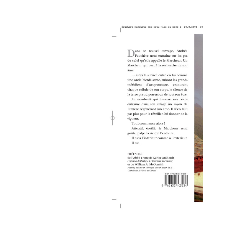 Dans ce nouvel ouvrage, Andrée Fauchère nous entraîne sur les pas de celui qu'elle appelle le Marcheur. Un Marcheur qui part à la recherche de son âme. ...alors le silence entre en lui comme une onde bienfaisante, suivant les grands méridiens d'acupuncture, entourant chaque cellule de son corps, le silence de la terre prend possession de tout son être. Le non bruit qui traverse son corps entraîne dans son sillage un rayon de lumière régénérant son âme. Il n'en faut pas plus pour la réveiller, lui donner de la vigueur. Tout commence alors! Attentif, éveillé, le Marcheur sent, goûte, palpe la vie qui l'entoure. Il est à l'intérieur comme à l'extérieur. Il est. Préfaces : de l'Abbé François-Xavier Amherdt, Professeur de théologie à l'Université de Fribourg et de William A. Mc Comish, Pasteur, docteur en théologie, ancien doyen de la Cathédrale St-Pierre de Genève.