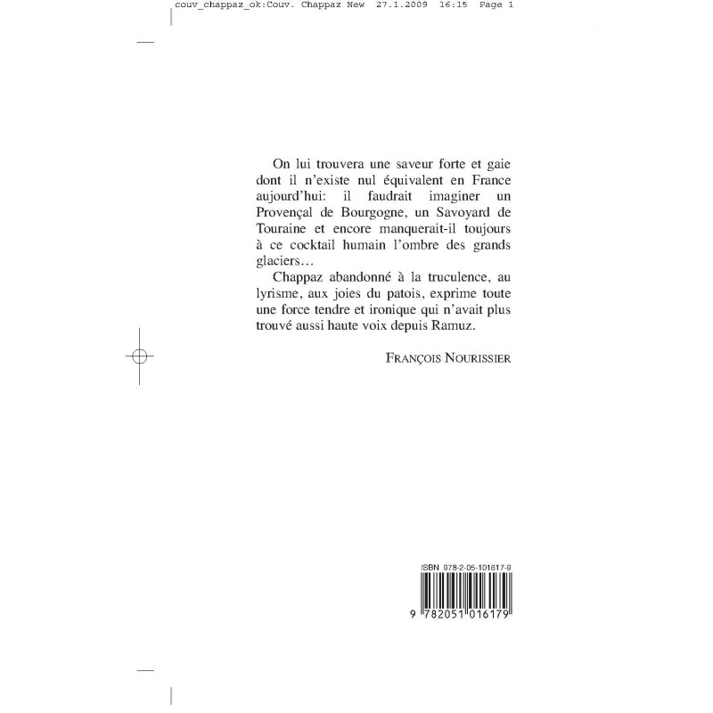 On lui trouvera une saveur forte et gaie dont il n`existe nul équivalent en France aujourd`hui : il faudrait imaginer un Provençal de Bourgogne, un Savoyard de Touraine et encore manquerait-il toujours à ce cocktail humain l`ombre des grands glaciers… Chappaz abandonné à la truculence, au lyrisme, aux joies du patois, exprime toute une force tendre et ironique qui n`avait plus trouvé aussi haute voix depuis Ramuz. (François Nourissier). Table : PREMIERE PARTIE : IMAGES INTÉRIEURES. Le rugissement matinal - Merde pour les primevères - La mélodie bédouine - La mort et les yeux - La plus belle histoire d`amour - Les anarchistes des vergers - Petit sabbat moderne - Les anciens m`appellent et le vin appelle sa mère - Les sains obscurs. Villages vendus pour une pomme, rachetés par un cœur - Les cloches et les chapeaux, bonjour ! DEUXIEME PARTIE : IMAGES D`EPINAL. Cherchez la vierge - La légende dorée par le vin des curés - les présidents va-cacô - Des soûlons à moi-même