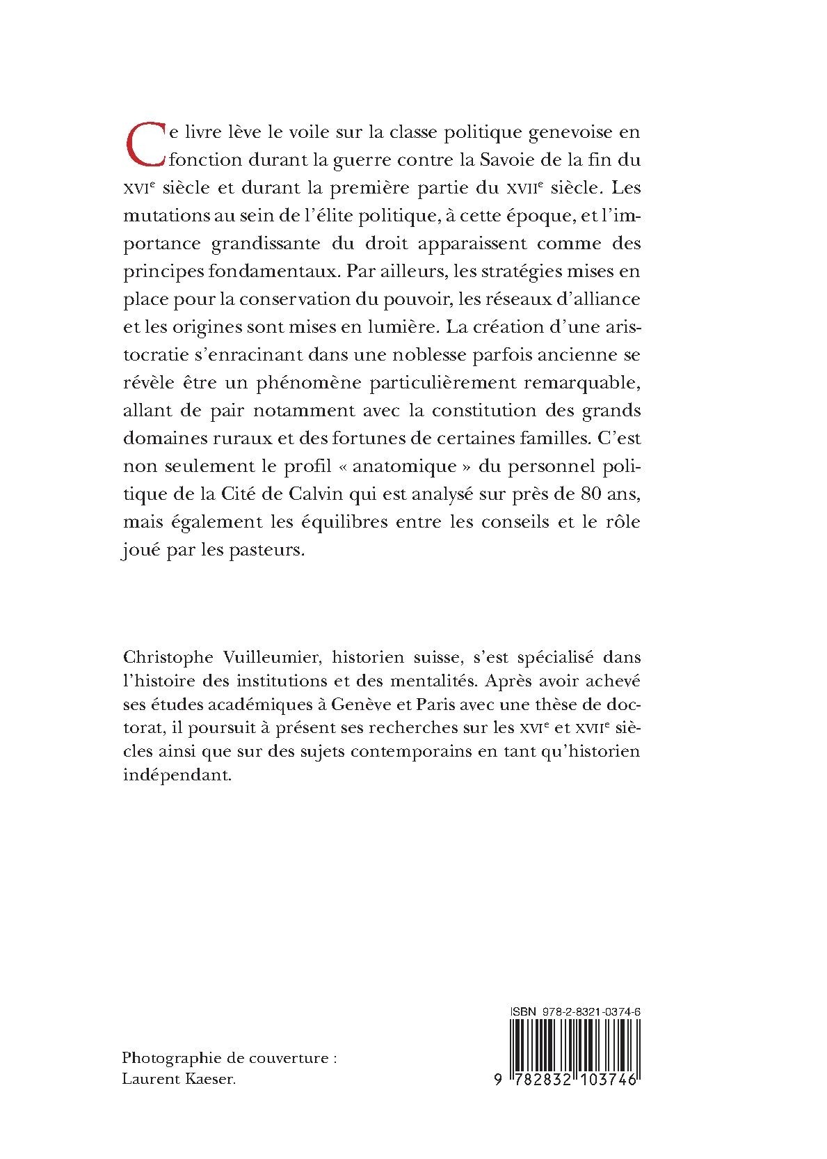Ce livre lève le voile sur la classe politique genevoise en fonction durant la guerre contre la Savoie de la fin du XVIe siècle et durant la première partie du XVIIe siècle. Les mutations au sein de l'élite politique, à cette époque, et l'importance grandissante du droit apparaissent comme des principes fondamentaux. Par ailleurs, les stratégies mises en place pour la conservation du pouvoir, les réseaux d'alliance et les origines sont mises en lumière. La création d'une aristocratie s'enracinant dans une noblesse parfois ancienne se révèle être un phénomène particulièrement remarquable, allant de pair notamment avec la constitution des grands domaines ruraux et des fortunes de certaines familles. C'est non seulement le profil " anatomique " du personnel politique de la Cité de Calvin qui est analysé sur près de 80 ans, mais également les équilibres entre les conseils et le rôle joué par les pasteurs. Christophe Vuilleumier, historien suisse, s'est spécialisé dans l'histoire des institutions et des mentalités. Après avoir achevé ses études académiques à Genève et Paris avec une thèse de doctorat, il poursuit à présent ses recherches sur les XVIe et XVIIe siècles ainsi que sur des sujets contemporains en tant qu'historien indépendant.