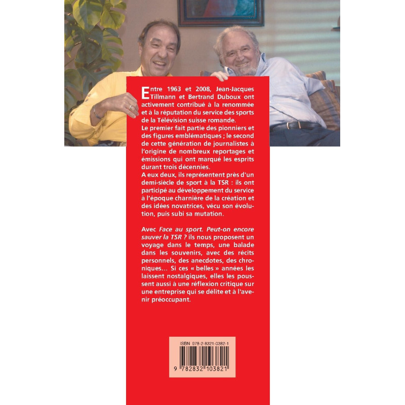 Entre 1963 et 2008, Jean-Jacques Tillmann et Bertrand Duboux ont activement contribué à la renommée et à la réputation du service des sports de la Télévision suisse romande. Le premier fait partie des pionniers et des figures emblématiques, le second de cette génération de journalistes à l'origine de nombreux reportages et émissions qui ont marqué les esprits. A eux deux, ils représentent près d'un demi-siècle de sport à la TSR : ils ont participé au développement du service, à la période charnière de la création et des idées novatrices, vécu son évolution, puis subi sa mutation. Avec Face au sport : peut-on encore sauver la TSR ?, ils nous proposent un voyage dans le temps, une balade dans les souvenirs, avec des récits personnels, des anecdotes, des chroniques… Si elles les laissent nostalgiques, ces " belles " années les poussent aussi à une réflexion critique sur une entreprise qui se délite et à l'avenir préoccupant.
