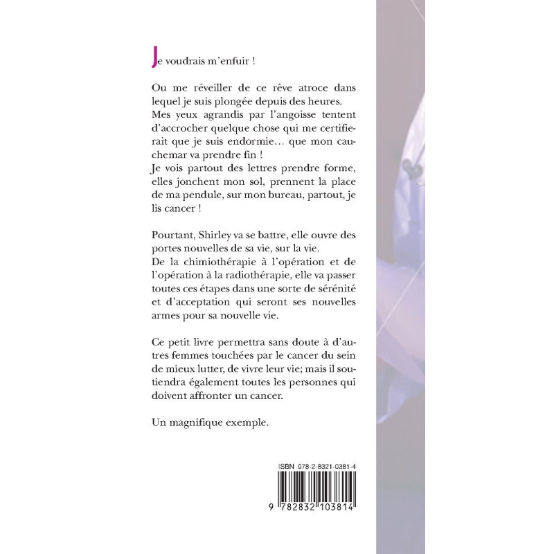 Je voudrais m'enfuir ! Ou me réveiller de ce rêve atroce dans lequel je suis plongée depuis des heures. Mes yeux agrandis par l'angoisse tentent d'accrocher quelque chose qui me certifierait que je suis endormie... que mon cauchemar va prendre fin ! Je vois partout des lettres prendre forme, elles jonchent mon sol, prennent la place de ma pendule, sur mon bureau, partout, je lis cancer ! Pourtant, Shirley va se battre, elle ouvre des portes nouvelles de sa vie, sur la vie. De la chimiothérapie à l'opération et de l'opération à la radiothérapie, elle va passer toutes ces étapes dans une sorte de sérénité et d'acceptation qui seront ses nouvelles armes pour sa nouvelle vie. Ce petit livre permettra sans doute à d'autres femmes touchées par le cancer du sein de mieux lutter, de vivre leur vie; mais il soutiendra également toutes les personnes qui doivent affronter un cancer. Un magnifique exemple.