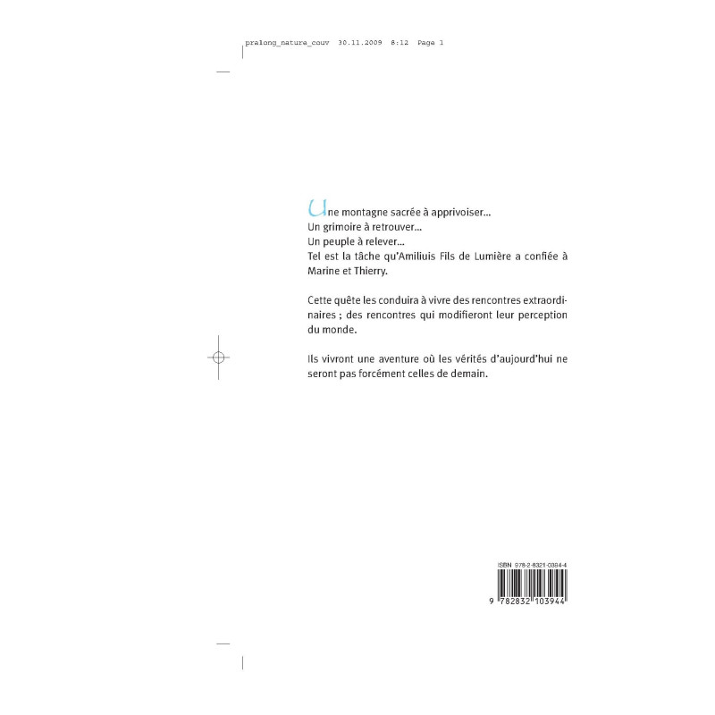 Une montagne sacrée à apprivoiser... Un grimoire à retrouver... Un peuple à relever... Telle est la tâche qu'Amiliuis Fils de Lumière a confiée à Marine et Thierry. Cette quête les conduira à vivre des rencontres extraordinaires; des rencontres qui modifieront leur perception du monde. Ils vivront une aventure où les vérités d'aujourd'hui ne seront pas forcément celles de demain.