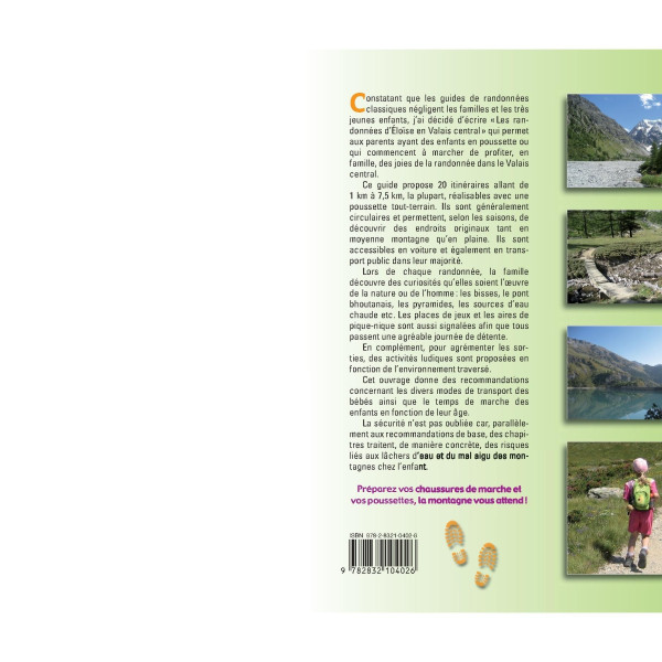 Suite à ce constat: les familles et les très jeunes enfants sont oubliés par les guides de randonnées classiques, j'ai décidé d'écrire Les Randonnées d'Eloïse en Valais central, qui permettent aux parents ayant des enfants en poussette ou qui commencent à marcher de profiter, en famille, des joies de la randonnée dans le Valais central. Ce guide propose 20 itinéraires allant de 1 km à 7,5km, la plupart réalisables avec une poussette tout-terrain. Ils sont généralement circulaires et permettent, selon les saisons, de découvrir des endroits originaux tant en moyenne montagne que dans la plaine. Ils sont atteignables en voiture et également en transport public dans leur majorité. Lors de chaque randonnée, la famille découvre des curiosités, qu'elles soient naturelles ou humaines, telles que les bisses, le pont bhoutanais, les pyramides, les sources d'eau chaude, etc. Les places de jeux et les aires de pique-nique sont aussi signalées afin que tous passent une agréable journée de détente. En complément, pour agrémenter les sorties, des activités ludiques sont proposées en fonction de l'environnement traversé. Cet ouvrage donne des recommandations concernant les divers moyens utilisables pour transporter les bébés ainsi que le temps de marche des enfants en fonction de leur âge. La sécurité n'est pas oubliée car, parallèlement aux recommandations de base, des chapitres traîtent, de manière concrète, des risques liés aux lâchers d'eau et du mal aigu des montagnes chez l'enfant. Préparez vos chaussures de marche et vos poussettes, la montagne vous attend! Pour plus d'informations consultez le site de l'auteur: www.randonneesdeloise.ch