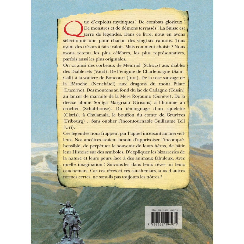 Que d`exploits mythiques ! De combats glorieux ! De monstres et de démons terrassés ! La Suisse est terre de légendes. Dans ce livre, nous en avons sélectionné une pour chacun des vingt-six cantons. Tous ayant des trésors à faire valoir. Mais comment choisir ? Nous avons retenu les plus célèbres, les plus représentatives, parfois aussi les plus originales. On va ainsi des corbeaux de Meinrad (Schwyz) aux diables des Diablerets (Vaud). De l`énigme de Charlemagne (Saint- Gall) à la vouivre de Boncourt (Jura). De la rose sauvage de la Béroche (Neuchâtel) aux dragons du mont Pilate (Lucerne). Des moutons au fond du lac de Cadagno (Tessin) au lancer de marmite de la Mère Royaume (Genève). De la déesse alpine sontga Margriata (Grisons) à l`homme au crochet (Schaffhouse). Du témoignage d`un squelette (Glaris), à Chalamala, le bouffon du comte de Gruyères (Fribourg)… Sans oublier l`incontournable Guillaume Tell (Uri). Ces légendes nous frappent par l`appel incessant au merveilleux. Nos ancêtres avaient besoin d`apprivoiser l`incompréhensible, de perpétuer le souvenir de leurs héros, de bâtir leur Histoire sur des symboles. D`expliquer les bizarreries de la nature et leurs peurs face à des animaux fabuleux. Avec quelle imagination ! Suivons-les dans leurs rêves ou leurs cauchemars. Car ces rêves et ces cauchemars, sous d`autres formes certes, ne sont-ils pas toujours les nôtres ?