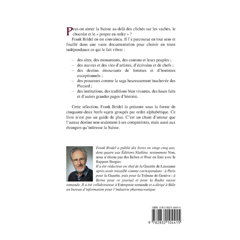 Peut-on aimer la Suisse au-delà des clichés sur les vaches, le chocolat et le " propre en ordre " ? Frank Bridel en est convaincu. Il l`a parcourue en tout sens et fouillé dans une vaste documentation pour choisir en toute indépendance ce qui le fait vibrer : - des sites, des monuments, des cantons et leurs peuples ; - des oeuvres et des vies d`artistes, d`écrivains et de chefs ; - des destins émouvants de femmes et d`hommes exceptionnels ; - des prouesses comme la saga heureusement inachevée des Piccard ; - des institutions, des traditions bien vivantes, des hauts faits et d`autres grandes pages d`histoire. Cette sélection, Frank Bridel la présente sous la forme de cinquante-deux brefs sujets groupés par ordre alphabétique. Ce livre n`est pas un guide de plus. C`est un chant d`amour que l`auteur destine non seulement à ses compatriotes, mais aussi aux étrangers qu`intéresse la Suisse. Frank Bridel a publié dix livres en vingt-cinq ans, dont quatre aux Éditions Slatkine, notamment Non, nous n`étions pas des lâches et Pour en finir avec le Rapport Bergier. Il a été rédacteur en chef de la Gazette de Lausanne après avoir travaillé comme correspondant : à Paris pour la Gazette, puis pour la Tribune de Genève ; à Berne pour ce journal et pour la Radio suisse romande. Il a été collaborateur à Entreprise romande et a dirigé à Bâle un bureau d`information pour l`industrie pharmaceutique.