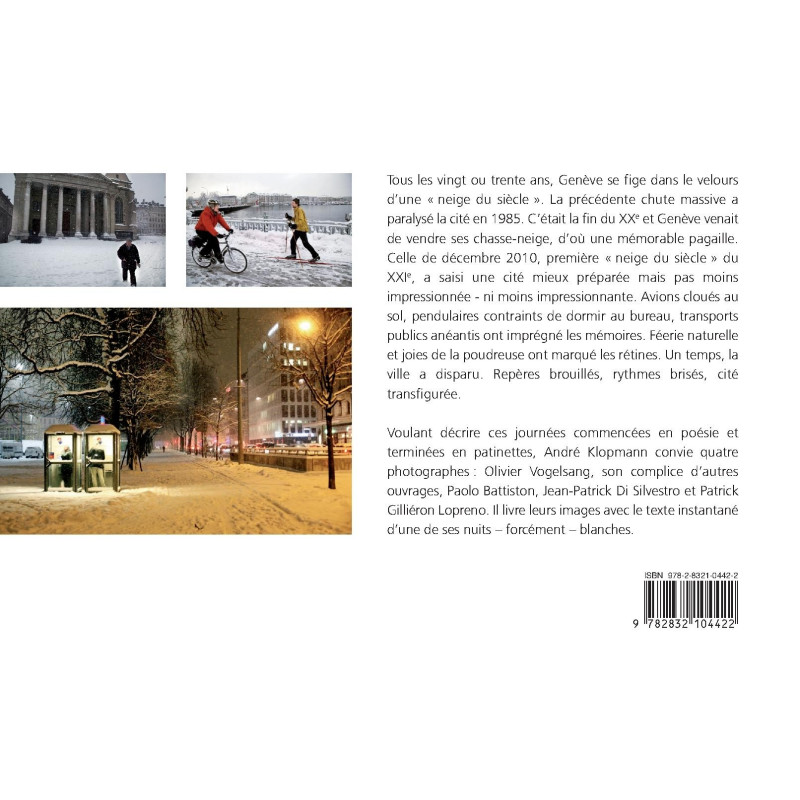 Tous les vingt ou trente ans, Genève se fige dans le velours d'une " neige du siècle ". La précédente chute massive a paralysé la cité en 1985. C'était la fin du XXe et Genève venait de vendre ses chasse-neige, d'où une mémorable pagaille. Celle de décembre 2010, première " neige du siècle " du XXIe, a saisi une cité mieux préparée mais pas moins impressionnée - ni moins impressionnante. Avions cloués au sol, pendulaires contraints de dormir au bureau, transports publics anéantis ont imprégné les mémoires. Féerie naturelle et joies de la poudreuse ont marqué les rétines. Un temps, la ville a disparu. Repères brouillés, rythmes brisés, cité transfigurée. Voulant décrire ces journées commencées en poésie et terminées en patinettes, André Klopmann convie quatre photographes : Olivier Vogelsang, son complice d'autres ouvrages, Paolo Battiston, Jean-Patrick Di Silvestro et Patrick Gilliéron Lopreno. Il livre leurs images avec le texte instantané d'une de ses nuits - forcément - blanches.