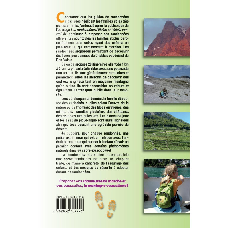 Constatant que les guides de randonnées classiques négligent les familles et les très jeunes enfants, j`ai décidé après la publication de l`ouvrage Les randonnées d`Éloïse en Valais central de continuer à proposer des randonnées attrayantes pour toutes les familles et plus particulièrement celles ayant des enfants en poussette ou qui commencent à marcher. Les randonnées proposées permettent de découvrir des faces peu connues du Chablais vaudois et du Bas-Valais. Ce guide propose 20 itinéraires allant de 1 km à 7 km, la plupart réalisables avec une poussette tout-terrain. Ils sont généralement circulaires et permettent, selon les saisons, de découvrir des endroits originaux tant en moyenne montagne qu`en plaine. Ils sont accessibles en voiture et également en transport public dans leur majorité. Lors de chaque randonnée, la famille découvre des curiosités, quelles soient l`œuvre de la nature ou de l`homme: des blocs erratiques, des mines, des marmites glaciaires, des châteaux, des réserves naturelles, etc. Les places de jeux et les aires de pique-nique sont aussi signalées afin que tous passent une agréable journée de détente. Je suggère, pour chaque randonnée, une petite expérience qui est en relation avec l`endroit parcouru et qui permet à l`enfant d`avoir un premier contact avec certains phénomènes naturels dans un cadre exceptionnel. La sécurité n`est pas oubliée car, en parallèle aux recommandations de base, un chapitre traite, de manière concrète, de l`assurage des enfants et des mesures de sécurité à adopter durant les randonnées. Préparez vos chaussures de marche et vos poussettes, la montagne vous attend ! Pour plus d`information consultez le site de l`auteur: www.randonneesdeloise.ch
