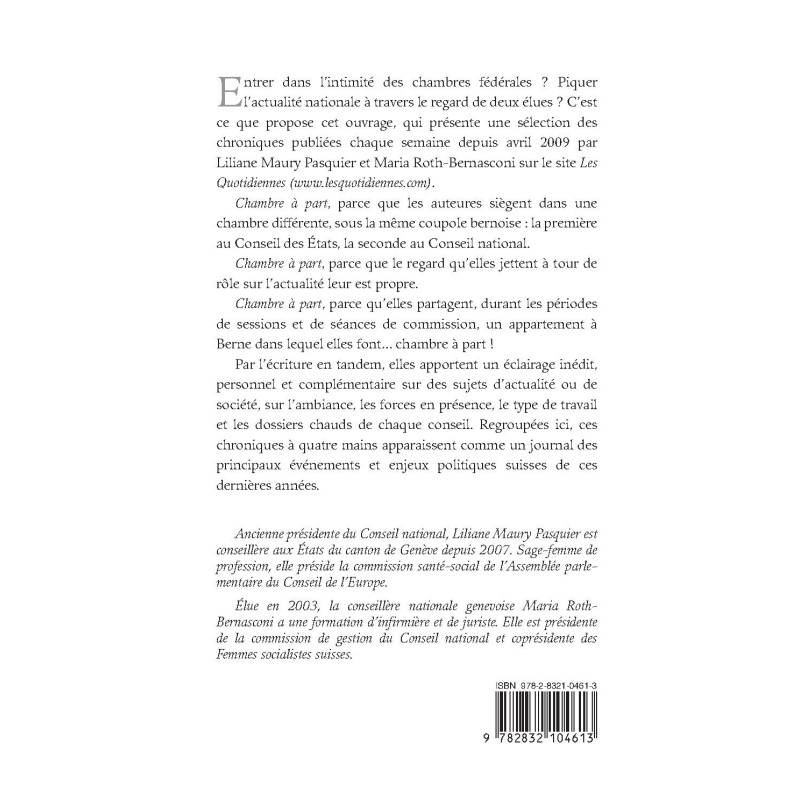 Entrer dans l`intimité des chambres fédérales ? Piquer l`actualité nationale à travers le regard de deux élues ? C`est ce que propose cet ouvrage, qui présente une sélection des chroniques publiées chaque semaine depuis avril 2009 par Liliane Maury Pasquier et Maria Roth-Bernasconi sur le site Les Quotidiennes. Chambre à part, parce que les auteures siègent dans une chambre différente, sous la même coupole bernoise : la première au Conseil des États, la seconde au Conseil national. Chambre à part, parce que le regard qu`elles jettent à tour de rôle sur l`actualité leur est propre. Chambre à part, parce qu`elles partagent, durant les périodes de sessions et de séances de commission, un appartement à Berne dans lequel elles font... chambre à part ! Par l`écriture en tandem, elles apportent un éclairage inédit, personnel et complémentaire sur des sujets d`actualité ou de société, sur l`ambiance, les forces en présence, le type de travail et les dossiers chauds de chaque conseil. Regroupées ici, ces chroniques à quatre mains apparaissent comme un journal des principaux événements et enjeux politiques suisses de ces dernières années. Ancienne présidente du Conseil national, Liliane Maury Pasquier est conseillère aux États du canton de Genève depuis 2007. Sage-femme de profession, elle préside la commission santé-social de l`Assemblée parlementaire du Conseil de l`Europe. Élue en 2003, la conseillère nationale genevoise Maria Roth-Bernasconi a une formation d`infirmière et de juriste. Elle est présidente de la commission de gestion du Conseil national et coprésidente des Femmes socialistes suisses.