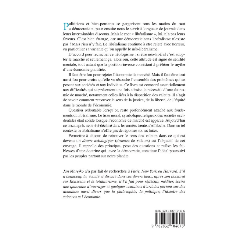 Politiciens et bien-pensants se gargarisent tous les matins du mot " démocratie ", pour ensuite nous le servir à longueur de journée dans leurs interminables discours. Mais le mot " libéralisme ", lui, n`a pas leurs faveurs. C`est bien étrange, car une démocratie sans libéralisme n`existe pas ! Mais rien n`y fait. Le libéralisme continue à être rejeté avec horreur, en particulier sa variante qu`on appelle le néo-libéralisme. D`accord pour recracher ce néologisme : si être néo-libéral c`est adopter le marché et seulement ça, alors oui, cette attitude est signe de sénilité mentale, tout autant que la position inverse consistant à préférer le mythe d`une économie planifiée. Il faut être fou pour rejeter l`économie de marché. Mais il faut être tout aussi fou pour croire qu`elle va résoudre l`ensemble des problèmes qui se posent aux sociétés et aux individus. Ce livre est consacré essentiellement aux difficultés qui se présentent une fois admise la nécessité d`une économie de marché, notamment celles liées à la disparition des valeurs. Il s`agit de savoir comment retrouver le sens de la justice, de la liberté, de l`équité dans le monde de l`économie. Question redoutable lorsqu`on reste profondément attaché aux fondements du libéralisme. Le tissu moral, symbolique, religieux des sociétés occidentales était solide lorsque l`économie de marché est apparue. Aujourd`hui ce tissu, après avoir été déchiré dans les années trente, s`effiloche. Dans un tel contexte, le libéralisme n`offre pas de réponses toutes faites. Permettre à chacun de retrouver le sens des valeurs dans ce qui est devenu un désert axiologique (absence de valeurs) est l`objectif de cet ouvrage. Il rappelle des principes, pose des questions et relève les faiblesses d`une doctrine qui, avec la démocratie, constitue l`idéal poursuivi par les peuples partout sur notre planète.