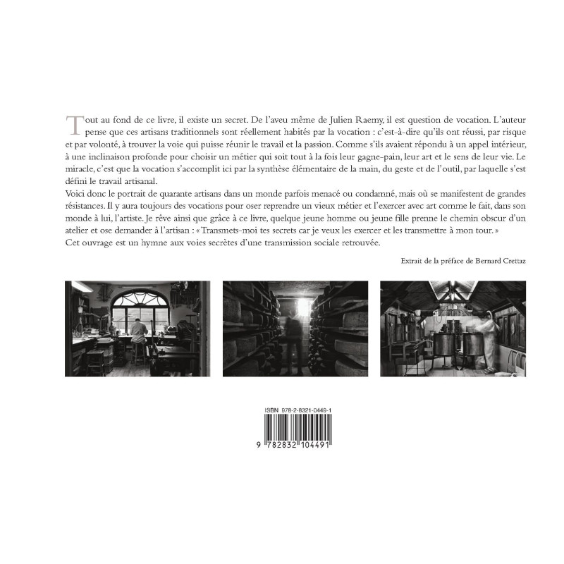 Tout au fond de ce livre, il existe un secret. De l`aveu même de Julien Raemy, il est question de vocation. L`auteur pense que ces artisans traditionnels sont réellement habités par la vocation : c`est-à-dire qu`ils ont réussi, par risque et par volonté, à trouver la voie qui puisse réunir le travail et la passion. Comme s`ils avaient répondu à un appel intérieur, à une inclinaison profonde pour choisir un métier qui soit tout à la fois leur gagne-pain, leur art et le sens de leur vie. Le miracle, c`est que la vocation s`accomplit ici par la synthèse élémentaire de la main, du geste et de l`outil, par laquelle s`est défini le travail artisanal. Voici donc le portrait de quarante artisans dans un monde parfois menacé ou condamné, mais où se manifestent de grandes résistances. Il y aura toujours des vocations pour oser reprendre un vieux métier et l`exercer avec art comme le fait, dans son monde à lui, l`artiste. Je rêve ainsi que grâce à ce livre, quelque jeune homme ou jeune fille prenne le chemin obscur d`un atelier et ose demander à l`artisan : " Transmets-moi tes secrets car je veux les exercer et les transmettre à mon tour. " Cet ouvrage est un hymne aux voies secrètes d`une transmission sociale retrouvée. Extrait de la préface de Bernard Crettaz.