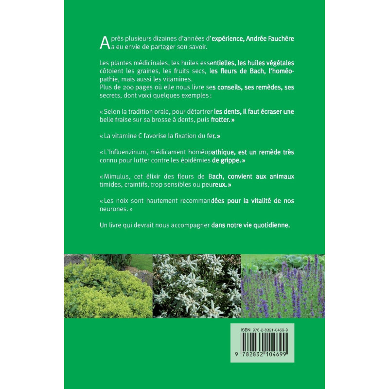 Après plusieurs dizaines d`années d`expérience, Andrée Fauchère a eu envie de partager son savoir. Les plantes médicinales, les huiles essentielles, les huiles végétales côtoient les graines, les fruits secs, les fleurs de Bach, l`homéopathie, mais aussi les vitamines. Plus de 200 pages où elle nous livre ses conseils, ses remèdes, ses secrets, dont voici quelques exemples: " Selon la tradition orale, pour détartrer les dents, il faut écraser une belle fraise sur sa brosse à dents, puis frotter. " " La vitamine C favorise la fixation du fer. " " L`Influenzinum, médicament homéopathique, est un remède très connu pour lutter contre les épidémies de grippe. " " Mimulus, cet élixir des fleurs de Bach, convient aux animaux timides, craintifs, trop sensibles ou peureux. " " Les noix sont hautement recommandées pour la vitalité de nos neurones. " Un livre qui devrait nous accompagner dans notre vie quotidienne.