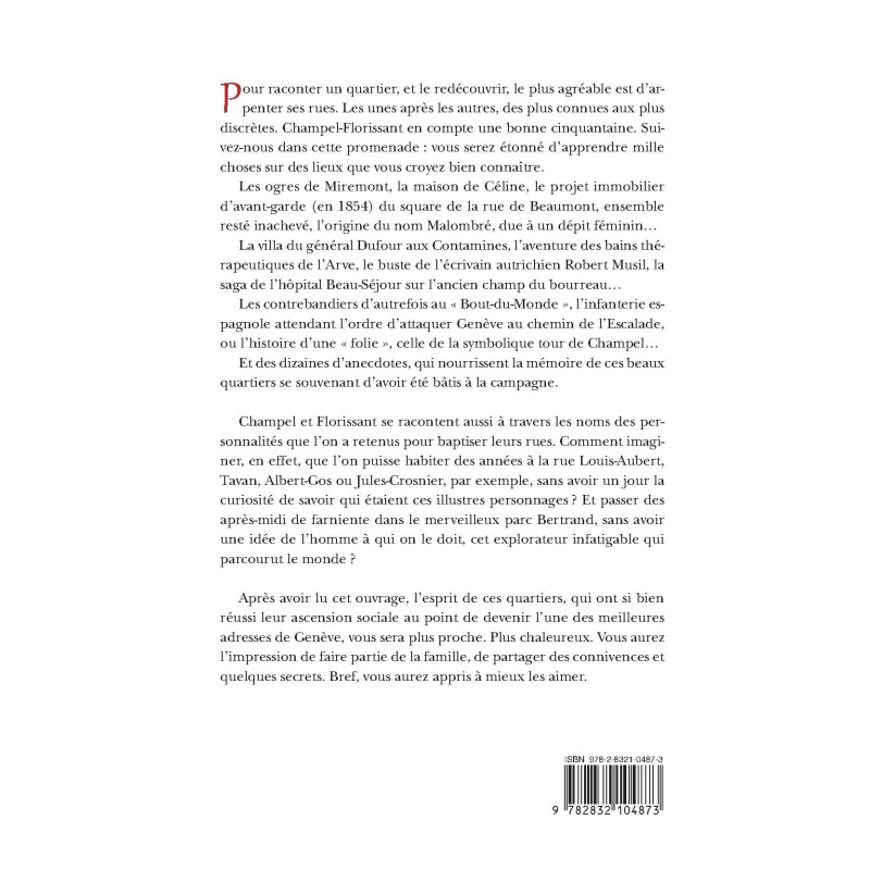 Pour raconter un quartier, et le redécouvrir, le plus agréable est d’arpenter ses rues. Les unes après les autres, des plus connues aux plus discrètes. Champel-Florissant en compte une bonne cinquantaine. Suivez- nous dans cette promenade : vous serez étonné d’apprendre mille choses sur des lieux que vous croyez bien connaître. Les ogres de Miremont, la maison de Céline, le projet immobilier d’avant-garde (en 1854) du square de la rue de Beaumont, ensemble resté inachevé, l’origine du nom Malombré, due à un dépit féminin… La villa du général Dufour aux Contamines, l’aventure des bains thérapeutiques de l’Arve, le buste de l’écrivain autrichien Robert Musil, la saga de l’hôpital Beau-Séjour sur l’ancien champ du bourreau… Les contrebandiers d’autrefois au « Bout-du-Monde », l’infanterie espagnole attendant l’ordre d’attaquer Genève au chemin de l’Escalade, ou l’histoire d’une « folie », celle de la symbolique tour de Champel… Et des dizaines d’anecdotes, qui nourrissent la mémoire de ces beaux quartiers se souvenant d’avoir été bâtis à la campagne. Champel et Florissant se racontent aussi à travers les noms des personnalités que l’on a retenus pour baptiser leurs rues. Comment imaginer, en effet, que l’on puisse habiter des années à la rue Louis-Aubert, Tavan, Albert-Gos ou Jules-Crosnier, par exemple, sans avoir un jour la curiosité de savoir qui étaient ces illustres personnages ? Et passer des après-midi de farniente dans le merveilleux parc Bertrand, sans avoir une idée de l’homme à qui on le doit, cet explorateur infatigable qui parcourut le monde ? Après avoir lu cet ouvrage, l’esprit de ces quartiers, qui ont si bien réussi leur ascension sociale au point de devenir l’une des meilleures adresses de Genève, vous sera plus proche. Plus chaleureux. Vous aurez l’impression de faire partie de la famille, de partager des connivences et quelques secrets. Bref, vous aurez appris à mieux les aimer.