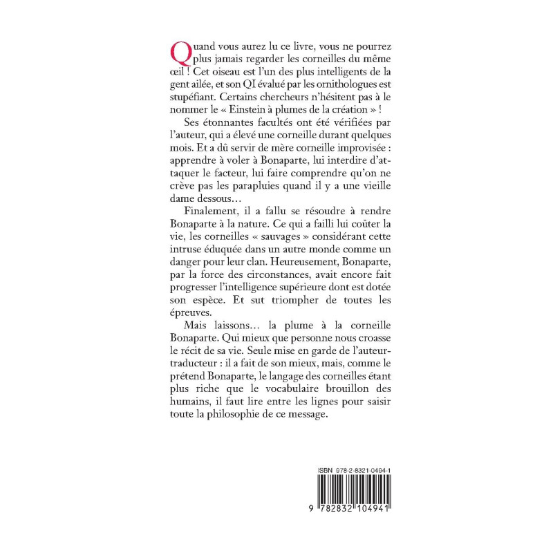 Quand vous aurez lu ce livre, vous ne regarderez plus jamais les corneilles du même œil ! Cet oiseau est l’un des plus intelligents de la gent ailée, et son QI évalué par les ornithologues est stupéfiant. Certains chercheurs n’hésitent pas à le nommer le « Einstein à plumes de la création » ! Ces étonnantes facultés ont été vérifiées par l’auteur qui a élevé une corneille durant quelques mois. Et a dû servir de mère corneille improvisée : comment apprendre à voler à Bonaparte, comment lui interdire d’attaquer le facteur, comment lui faire comprendre qu’on ne crève pas les parapluies quand il y a une vieille dame dessous… Finalement, il a fallu se résoudre à rendre Bonaparte à la nature. Ce qui a failli lui coûter la vie, les corneilles « sauvages » considérant cette intruse éduquée dans un autre monde comme un danger pour leur clan. Heureusement, Bonaparte, par la force des circonstances, avait encore fait progresser cette intelligence supérieure dont est dotée son espèce. Et a su triompher de toutes les épreuves Mais laissons… la plume à la corneille Bonaparte. Qui mieux que personne nous croasse le récit de sa vie. Seule mise en garde de l’auteur-traducteur : il a fait de son mieux, mais, comme le prétend Bonaparte, le langage des corneilles étant plus riche que le vocabulaire brouillon des humains, il faut lire entre les lignes pour saisir toute la philosophie de ce message.