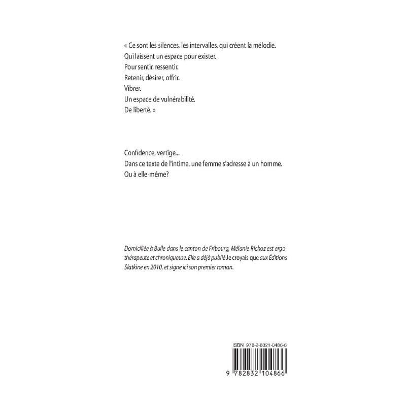« Ce sont les silences, les intervalles, qui créent la mélodie. Qui laissent un espace pour exister. Pour sentir, ressentir. Retenir, désirer, offrir. Vibrer. Un espace de vulnérabilité. De liberté. » Confidence, vertige... Dans ce texte de l`intime, une femme s`adresse à un homme. Ou à elle-même? Domiciliée à Bulle dans le canton de Fribourg, Mélanie Richoz est ergothérapeute et chroniqueuse. Elle a déjà publié Je croyais que aux Éditions Slatkine en 2010, et signe ici son premier roman.