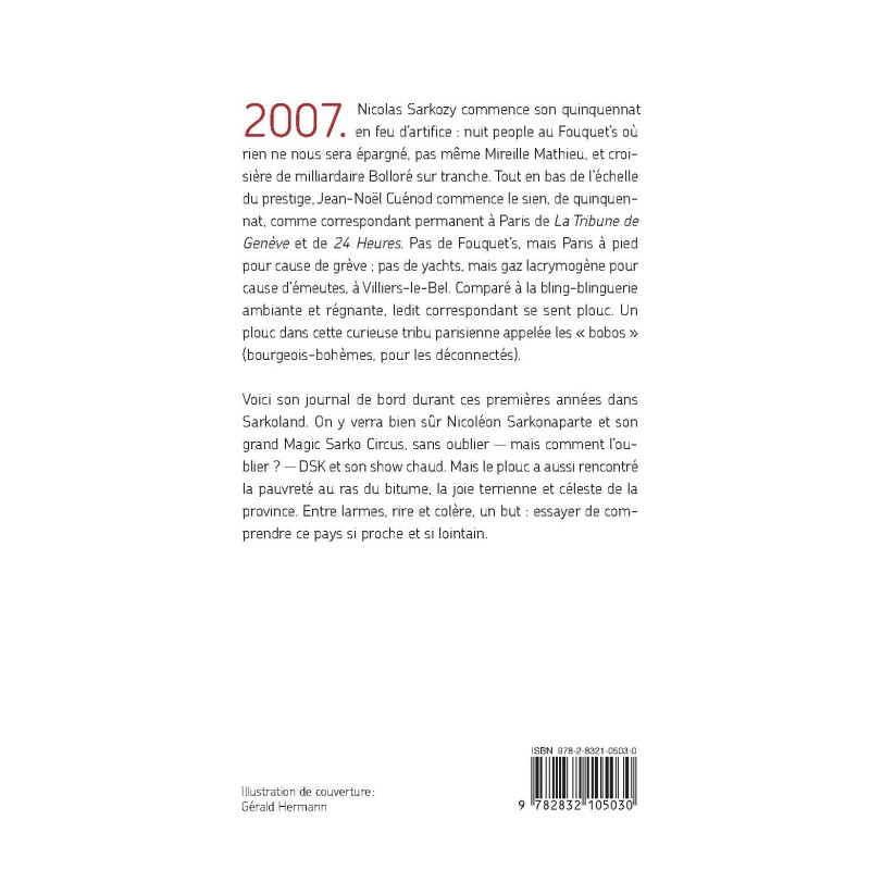 2007. Nicolas Sarkozy commence son quinquennat en feu d’artifice : nuit people au Fouquet’s où rien ne nous sera épargné, pas même Mireille Mathieu, et croisière de milliardaire Bolloré sur tranche. Tout en bas de l’échelle du prestige, Jean-Noël Cuénod commence le sien, de quinquennat, comme correspondant permanent à Paris de La Tribune de Genève et de 24 Heures. Pas de Fouquet’s, mais Paris à pied pour cause de grève ; pas de yachts, mais gaz lacrymogène pour cause d’émeutes, à Villiers-le-Bel. Comparé à la bling-blinguerie ambiante et régnante, ledit correspondant se sent plouc. Un plouc dans cette curieuse tribu parisienne appelée les « bobos » (bourgeois bohèmes, pour les déconnectés). Voici son journal de bord durant ces premières années dans Sarkoland. On y verra bien sûr Nicoléon Sarkonaparte et son grand Magic Sarko Circus, sans oublier — mais comment l’oublier ? — DSK et son show chaud. Mais le plouc a aussi rencontré la pauvreté au ras du bitume, la joie terrienne et céleste de la province. Entre larmes, rire et colère, un but : essayer de comprendre ce pays si proche et si lointain.
