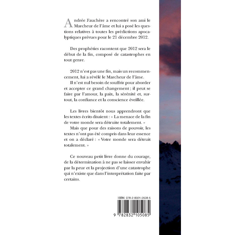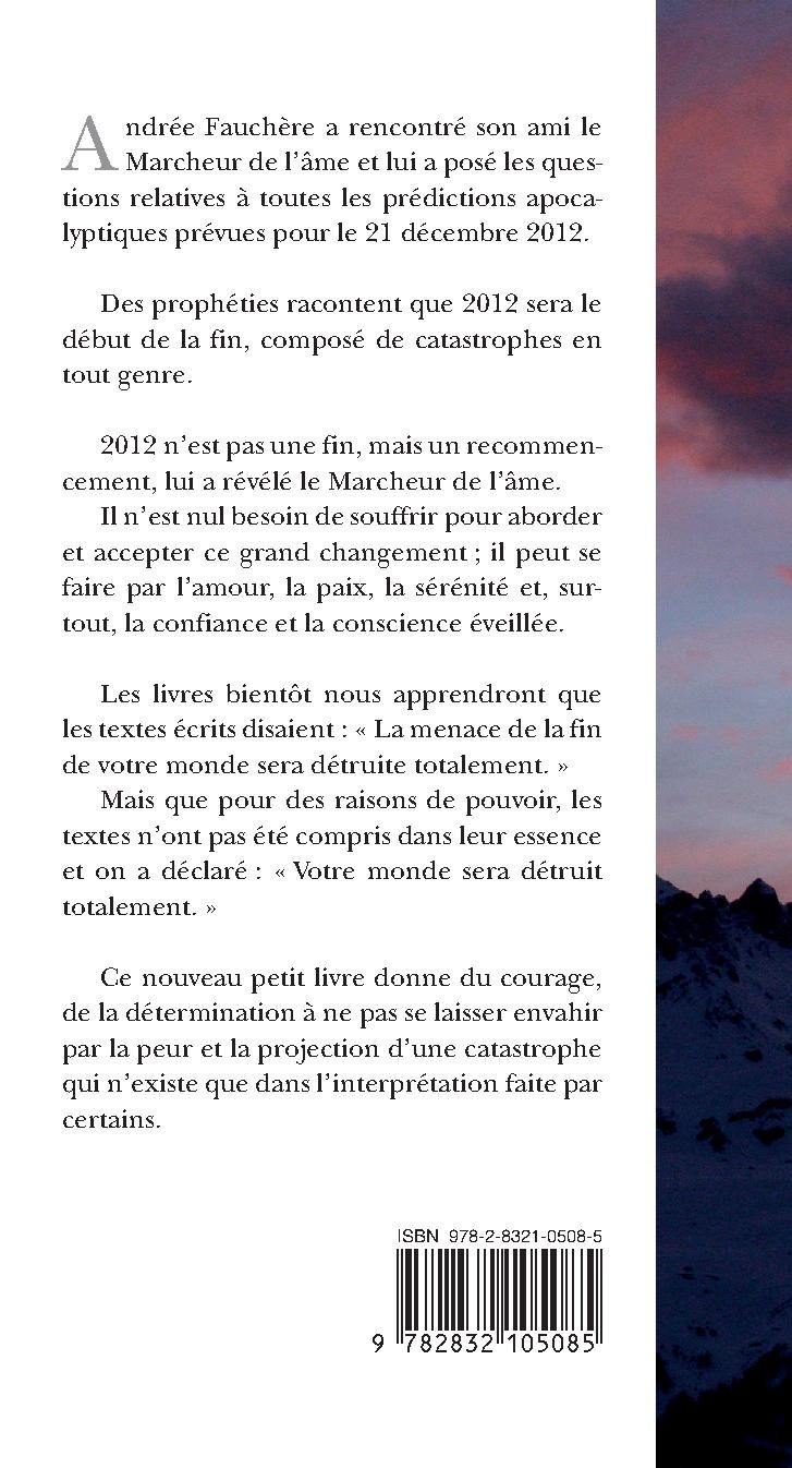 Andrée Fauchère a rencontré son ami le Marcheur de l’âme et lui a posé les questions relatives à toutes les prédictions apocalyptiques prévues pour le 21 décembre 2012. Des prophéties racontent que 2012 sera le début de la fin, composé de catastrophes en tout genre. 2012 n’est pas une fin, mais un recommencement, lui a révélé le Marcheur de l’âme. Il n’est nul besoin de souffrir pour aborder et accepter ce grand changement ; il peut se faire par l’amour, la paix, la sérénité et, surtout, la confiance et la conscience éveillée. Les livres bientôt nous apprendront que les textes écrits disaient : « La menace de la fin de votre monde sera détruite totalement. » Mais que pour des raisons de pouvoir, les textes n’ont pas été compris dans leur essence et on a déclaré : « Votre monde sera détruit totalement. » Ce nouveau petit livre donne du courage, de la détermination à ne pas se laisser envahir par la peur et la projection d’une catastrophe qui n’existe que dans l’interprétation faite par certains.
