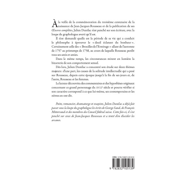 À la veille de la commémoration du troisième centenaire de la naissance de Jean-Jacques Rousseau et de la publication de ses Œuvres complètes, Julien Dunilac s’est penché sur son écriture, avec la loupe du graphologue averti qu’il est. Il s’est demandé quelle est la période de sa vie qui a conduit le philosophe à éprouver le « deuil éclatant du bonheur ». Certainement celle des «Brouilles de l’Ermitage » allant de l’automne de 1757 au printemps de 1758, au cours de laquelle Rousseau perdit tous ses amis et amies. Dans le même temps, les circonstances mirent en lumière la bizarrerie de son comportement sexuel. Dès lors, Julien Dunilac a concentré son étude sur deux thèmes majeurs : d’une part, les causes de la solitude intellectuelle qui a pesé sur Rousseau, depuis cette époque jusqu’à la fin de ses jours et, de l’autre, Rousseau et les femmes. Le lecteur découvrira des commentaires et des hypothèses originaux concernant ce grand personnage du XVIIIe siècle et pourra vérifier si son caractère correspond à ce que lui-même, ses contemporains et les nôtres en ont dit.
