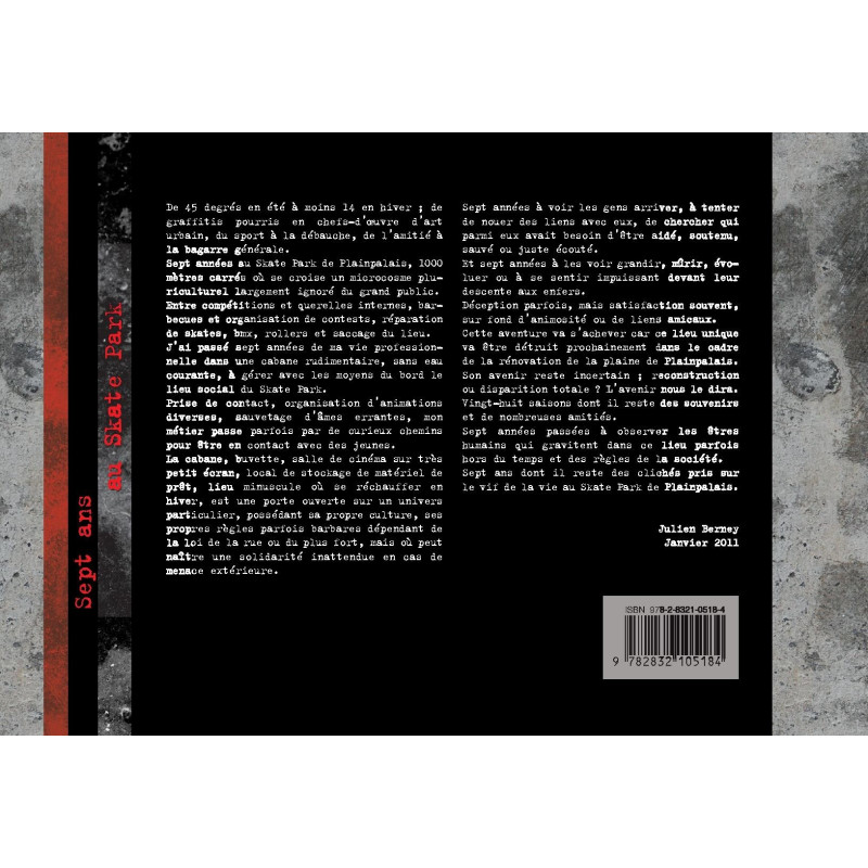 De 45 degrés en été à moins 14 en hiver ; de graffitis pourris en chefs-d’œuvre d’art urbain, du sport à la débauche, de l’amitié à la bagarre générale. Sept années au skatepark de Plainpalais, 1000 mètres carrés où se croise un microcosme pluriculturel largement ignoré du grand public. Entre compétition et querelles internes, barbecures et organisation de contests, réparation de skates, bmx, rollers et saccage du lieu. J’ai passé sept années de ma vie professionnelle dans une cabane rudimentaire, sans eau courante, à gérer avec les moyens du bord le lieu social du skatepark. Prise de contact organisation d’animations diverses, sauvetage d’âmes errantes, mon métier passe parfois par de curieux chemins pour être en contact avec des jeunes. La cabane, buvette, salle de cinéma sur très petit écran, local de stockage de matériel de prêt, lieu minuscule ou se réchauffer en hiver, est une porte ouverte sur un univers particulier, possédant sa propre culture, ses propres règles parfois barbares dépendant de la loi de la rue ou du plus fort, mais où peut naître une solidarité inattendue en cas de menace extérieure. Sept années à voir les gens arriver, à tenter de nouer des liens avec eux, de chercher qui parmi eux avait besoin d’être aidé, soutenu, sauvé ou juste écouté. Et sept années à les voir grandir, mûrir, évoluer ou à se sentir impuissant devant leur descente aux enfers. Déception parfois, mais satisfaction souvent, sous fond d’animosité ou de liens amicaux. Une aventure qui s’achève avec la rénovation de la plaine de Plainpalais. Vingt-huit saisons dont il reste des souvenirs et de nombreuses amitiés. Sept années passées à observer les êtres humains qui gravitent dans ce lieu parfois hors du temps et des règles de la société. Sept ans dont il reste des clichés pris sur le vif de la vie au skatepark de Plainpalais.