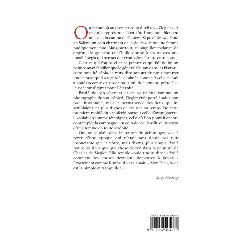 On reconnaît au premier coup d’œil un « Ziegler » . A ce qu’il représente, bien sûr. Immanquablement une vue du canton de Genève. Si possible avec fond de Salève, un coin charmant de la vieille-ville ou une femme pudiquement nue. Mais surtout, ce singulier mélange de crayon, de gouache et d’huile donne à ses œuvres une tonalité sépia qui fait reconnaître l’artiste entre tous…¨ C’est ce qui frappe, chez ce peintre. Et qui fait de lui un peintre aussi familier que le général Guisan dans les bistrots : cette tonalité sépia, je veux dire son art de nous montrer toute chose qu’il a regardée et aimée comme si celle-ci avait aussitôt accepté de poser pour lui, docilement prête à se laisser transfigurer pour l’éternité. Bardé de son chevalet et de sa palette comme un photographe de son trépied, Ziegler était porté à saisir non pas l’instantané mais la permanence des lieux qui lui semblaient les plus dignes de résister au temps. De cette première moitié de vingtième siècle, surtout celle avant-guerre, il voulait en somme témoigner ; celle où l’on pouvait encore contempler la campagne, un coin de vieille-ville ou le corps d’une femme en toute sérénité. Oui, on se plait, dans les oeuvres du peintre genevois, à rêver d’une époque qui n’était sans doute pas plus insouciante que la nôtre, mais disons, plus simple. Voilà pourquoi il y a quelque chose de zen dans la peinture de Charles de Ziegler. Elle semble vouloir nous dire « Voilà comment les choses devraient demeurer à jamais ». Exactement comme Rimbaud s’exclamait « Mon Dieu, mon Dieu, la vie est là , simple et tranquille ! » Serge Bimpage