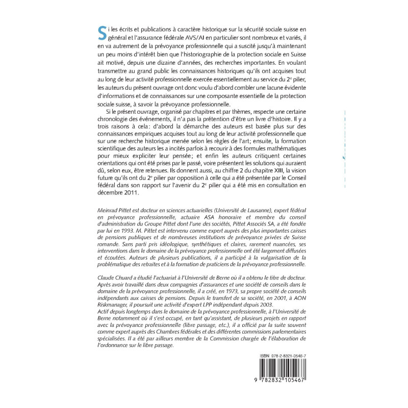 Si les écrits et publications à caractère historique sur la sécurité sociale suisse en général et l’assurance fédérale AVS/AI en particulier sont nombreux et variés, il en va autrement de la prévoyance professionnelle qui a suscité jusqu’à maintenant un peu moins d’intérêt bien que l’historiographie de la protection sociale en Suisse ait motivé, depuis une dizaine d’années, des recherches importantes. En voulant transmettre au grand public les connaissances historiques qu’ils ont acquises tout au long de leur activité professionnelle exercée essentiellement au service du 2e pilier, les auteurs du présent ouvrage ont donc voulu d’abord combler une lacune évidente d’informations et de connaissances sur une composante essentielle de la protection sociale suisse, à savoir la prévoyance professionnelle. Si le présent ouvrage, organisé par chapitres et par thèmes, respecte une certaine chronologie des événements, il n’a pas la prétention d’être un livre d’histoire. Il y a trois raisons à cela: d’abord la démarche des auteurs est basée plus sur des connaissances empiriques acquises tout au long de leur activité professionnelle que sur une recherche historique menée selon les règles de l’art; ensuite, la formation scientifique des auteurs les a incités parfois à recourir à des formules mathématiques pour mieux expliciter leur pensée; et enfin les auteurs critiquent certaines orientations qui ont été prises par le passé, voire présentent les solutions qui auraient dû, selon eux, être retenues. Ils donnent aussi, au chiffre 2 du chapitre XIII, la vision future qu’ils ont du 2e pilier par opposition à celle qui a été présentée par le Conseil fédéral dans son rapport sur l’avenir du 2e pilier qui a été mis en consultation en décembre 2011.