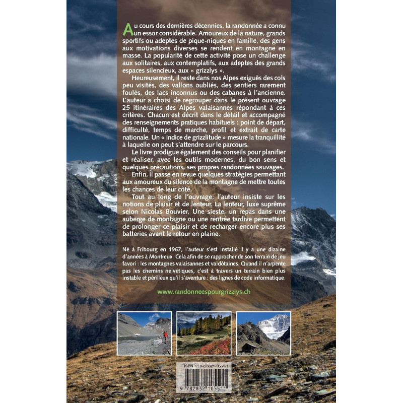 Au cours des dernières décennies, la randonnée a connu un essor considérable. Amoureux de la nature, grands sportifs ou adeptes de pique-niques en famille, des gens aux motivations diverses se rendent en montagne en masse. La popularité de cette activité pose un challenge aux solitaires, aux contemplatifs, aux adeptes des grands espaces silencieux, aux « grizzlys ». Heureusement, il reste dans nos Alpes exiguës des cols peu visités, des vallons oubliés, des sentiers rarement foulés, des lacs inconnus ou des cabanes à l’ancienne. L’auteur a choisi de regrouper dans le présent ouvrage 25 itinéraires des Alpes valaisannes répondant à ces critères. Chacun est décrit dans le détail et accompagné des renseignements pratiques habituels : point de départ, difficulté, temps de marche, profil et extrait de carte nationale. Un « indice de grizzlitude » mesure la tranquillité à laquelle on peut s’attendre sur le parcours. Le livre prodigue également des conseils pour planifier et réaliser, avec les outils modernes, du bon sens et quelques précautions, ses propres randonnées sauvages. Enfin, il passe en revue quelques stratégies permettant aux amoureux du silence de la montagne de mettre toutes les chances de leur côté. Tout au long de l’ouvrage, l’auteur insiste sur les notions de plaisir et de lenteur. La lenteur, luxe suprême selon Nicolas Bouvier. Une sieste, un repas dans une auberge de montagne ou une rentrée tardive permettent de prolonger ce plaisir et de recharger encore plus ses batteries avant le retour en plaine.