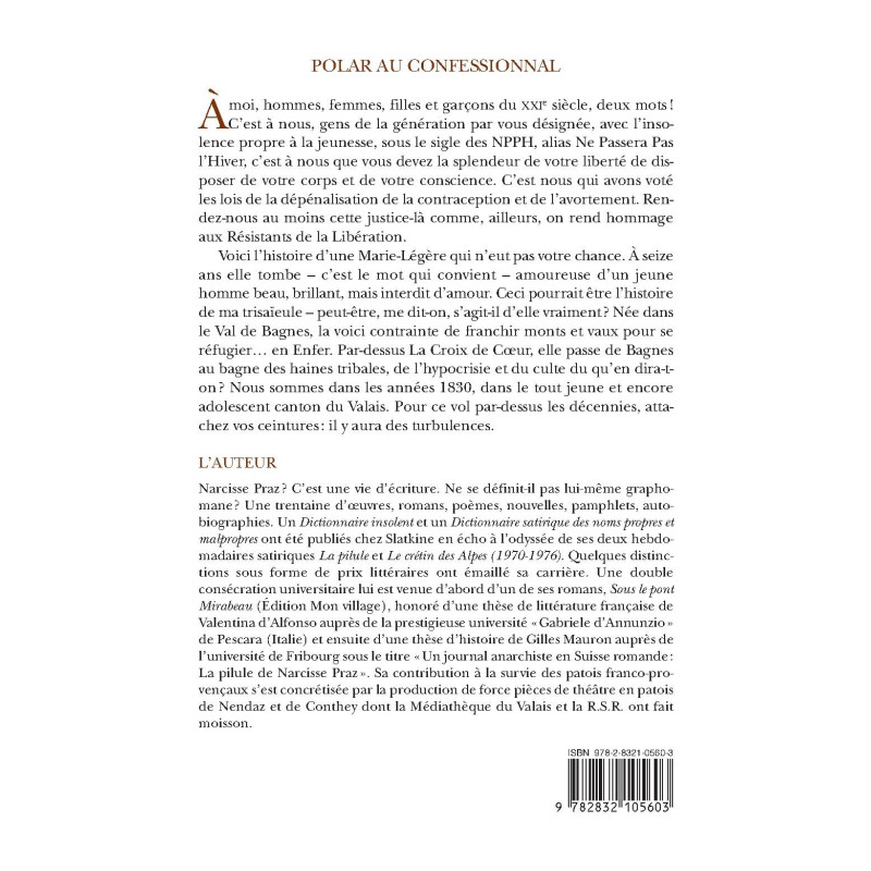 À moi, hommes, femmes, filles et garçons du XXIe siècle, deux mots ! C’est à nous, gens de la génération par vous désignée, avec l’insolence propre à la jeunesse, sous le sigle des NPPH, alias Ne Passera Pas l’Hiver, c’est à nous que vous devez la splendeur de votre liberté de disposer de votre corps et de votre conscience. C’est nous qui avons voté les lois de la dépénalisation de la contraception et de l’avortement. Rendez-nous au moins cette justice-là comme, ailleurs, on rend hommage aux Résistants de la Libération. Voici l’histoire d’une Marie-Légère qui n’eut pas votre chance. À seize ans elle tombe – c’est le mot qui convient – amoureuse d’un jeune homme beau, brillant, mais interdit d’amour. Ceci pourrait être l’histoire de ma trisaïeule – peut-être, me dit-on, s’agit-il d’elle vraiment ? Née dans le Val de Bagnes, la voici contrainte de franchir monts et vaux pour se réfugier… en Enfer. Par-dessus La Croix de Cœur, elle passe de Bagnes au bagne des haines tribales, de l’hypocrisie et du culte du qu’en dira-ton? Nous sommes dans les années 1830, dans le tout jeune et encore adolescent canton du Valais. Pour ce vol par-dessus les décennies, attachez vos ceintures : il y aura des turbulences.