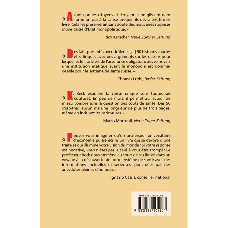 «K. Beck examine la caisse unique sous toutes ses coutures. En peu de mots, il permet au lecteur de mieux comprendre la question des coûts de santé. Des 50 chapitres, aucun n’a une longueur de plus de trois pages, même en incluant les caricatures.» Marco Morosoli, Neue Zuger Zeitung