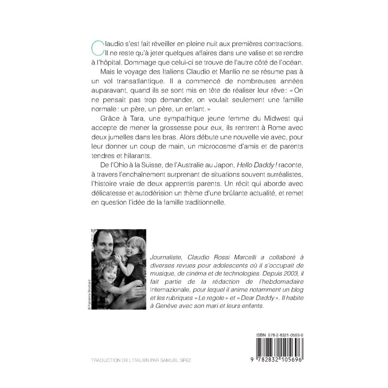 Claudio s’est fait réveiller en pleine nuit aux premiers signes de contractions. Il ne reste qu’à jeter quelques affaires dans une valise et se rendre à l’hôpital. Dommage que celui-ci se trouve de l’autre côté de l’Atlantique. Mais le voyage des Italiens Claudio et Manlio a commencé de nombreuses années auparavant, quand ils se sont mis en tête de réaliser leur rêve : « On ne pensait pas trop demander, on voulait seulement une famille normale : un père, un père, un enfant. » Grâce à Tara, une sympathique jeune femme du Midwest qui accepte de mener la grossesse pour eux, ils rentrent à Rome avec deux jumelles dans les bras. Pour leur donner un coup de main, il y a un microcosme d’amis et de parents tendres et hilarants. De l’Ohio à la Suisse, de l’Australie au Japon, Hello Daddy ! raconte, à travers l’enchaînement surprenant de situations souvent surréalistes, l’histoire vraie de deux apprentis parents. Un récit qui aborde avec délicatesse et autodérision un thème d’une brûlante actualité, l’homoparentalité, et remet en question l’idée de la famille traditionnelle. Journaliste, Claudio Rossi Marcelli a collaboré à diverses revues pour adolescents où il s’occupait de musique, de cinéma et de technologies. Depuis 2003, il fait partie de la rédaction de l’hebdomadaire L’Internazionale, pour lequel il anime notamment un blog et les rubriques « Le regole » et « Dear Daddy ». Il habite à Genève avec son mari et leurs enfants.
