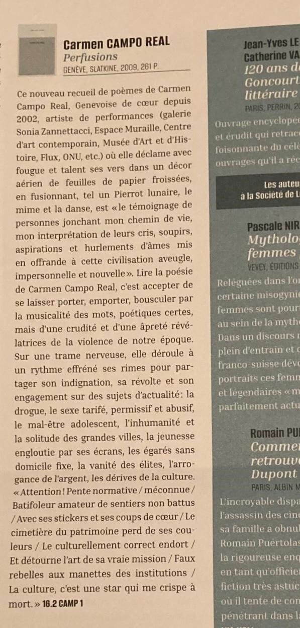 Carmen Campo Real est née en 1968. Perfusions est son premier recueil de poésie aux Éditions Slatkine. Pendant plus de 15 ans Carmen Campo Real sillonne le globe et collabore comme journaliste à de nombreux magazines, agences de Presse et médias prestigieux tels : le New Yorker, Rolling Stone, Vogue, Elle, Jardin Des Modes, Glamour, Traveler, Sipa, Sygma, TF1… Elle s'installe à Genève en 2002. Parallèlement à son travail poétique prolifique, elle effectue en tant qu'artiste plusieurs expositions mettant en scène ses poèmes : peintures, calligraphies, sculptures, vidéo installations. Carmen Campo Real est mariée et a deux enfants. Elle travaille à son prochain recueil de poésie et oeuvre à des projets d'actions sociales.
