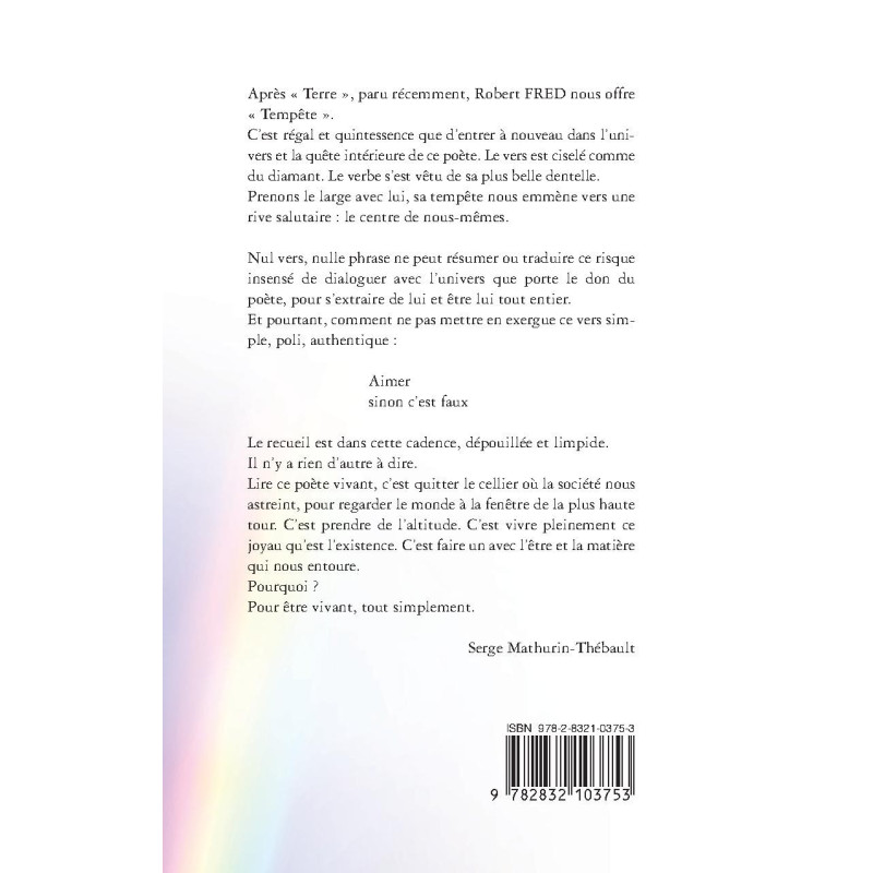 "Après Terre, paru récemment, Robert Fred nous offre Tempête. C'est régal et quintessence que d'entrer à nouveau dans l'univers et la quête intérieure de ce poète. Le vers est ciselé comme du diamant. Le verbe s'est vêtu de sa plus belle dentelle. Prenons le large avec lui, sa tempête nous emmène vers une rive salutaire: le centre de nous- mêmes. Nul vers, nulle phrase ne peut résumer ou traduire ce risque insensé de dialoguer avec l'univers que porte le don du poète, pour s'extraire de lui et être lui tout entier. Et pourtant, comment ne pas mettre en exergue ce vers simple, poli, authentique: Aimer sinon c'est faux. Le recueil est dans cette cadence, dépouillé et limpide. Il n'y a rien d'autre à dire. Lire ce poète vivant, c'est quitter le cellier où la société nous astreint, pour regarder le monde à la fenêtre de la plus haute tour. C'est prendre de l'altitude. C'est vivre pleinement ce joyau qu'est l'existence. C'est faire un avec l'être et la matière qui nous entoure. Pourquoi ? Pour être vivant, tout simplement." Serge Mathurin-Thébault