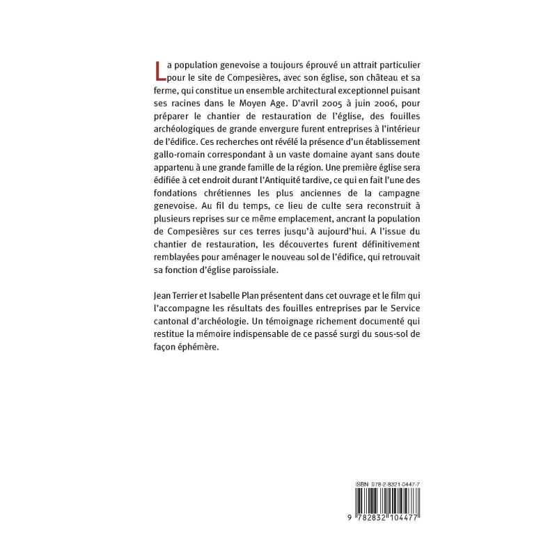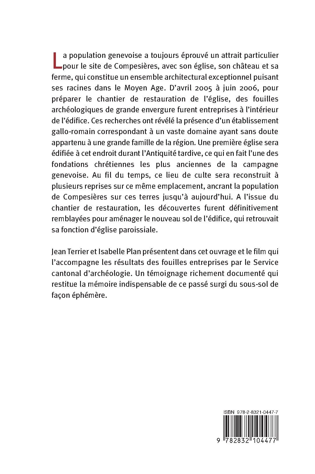 La population genevoise a toujours éprouvé un attrait particulier pour le site de Compesières, avec son église, son château et sa ferme, qui constitue un ensemble architectural exceptionnel puisant ses racines dans le Moyen Age. D'avril 2005 à juin 2006, pour préparer le chantier de restauration de l'église, des fouilles archéologiques de grande envergure furent entreprises à l'intérieur de l'édifice. Ces recherches ont révélé la présence d'un établissement gallo-romain correspondant à un vaste domaine ayant sans doute appartenu à une grande famille de la région. Une première église sera édifiée à cet endroit durant l'Antiquité tardive, ce qui en fait l'une des fondations chrétiennes les plus anciennes de la campagne genevoise. Au fil du temps, ce lieu de culte sera reconstruit à plusieurs reprises sur ce même emplacement, ancrant la population de Compesières sur ces terres jusqu'à aujourd'hui. A l'issue du chantier de restauration, les découvertes furent définitivement remblayées pour aménager le nouveau sol de l'édifice, qui retrouvait sa fonction d'église paroissiale. Jean Terrier et Isabelle Plan présentent dans cet ouvrage et le film qui l'accompagne les résultats des fouilles entreprises par le Service cantonal d'archéologie. Un témoignage richement documenté qui restitue la mémoire indispensable de ce passé surgi du sous-sol de façon éphémère.