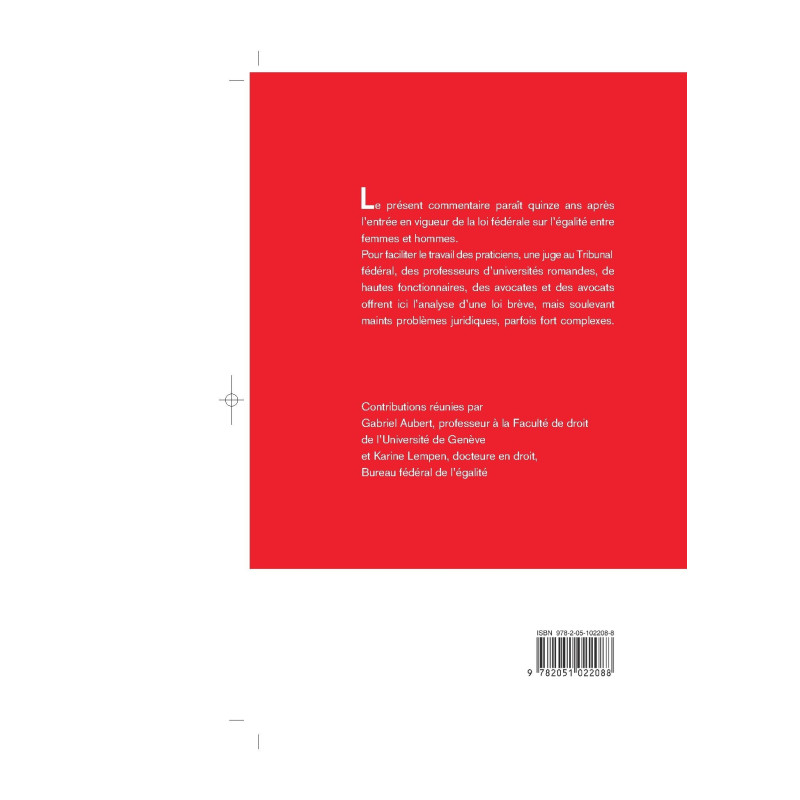 Le présent commentaire paraît quinze ans après l'entrée en vigueur de la loi fédérale sur l'égalité entre femmes et hommes. Pour faciliter le travail des praticiens, une juge au Tribunal fédéral, des professeurs d'universités romandes, de hautes fonctionnaires, des avocates et des avocats offrent ici l'analyse d'une loi brève, mais soulevant maints problèmes juridiques, parfois fort complexes. Contributions réunies par Gabriel Aubert, professeur à la Faculté de droit de l'Université de Genève et Karine Lempen, docteure en droit, Bureau fédéral de l'égalité.