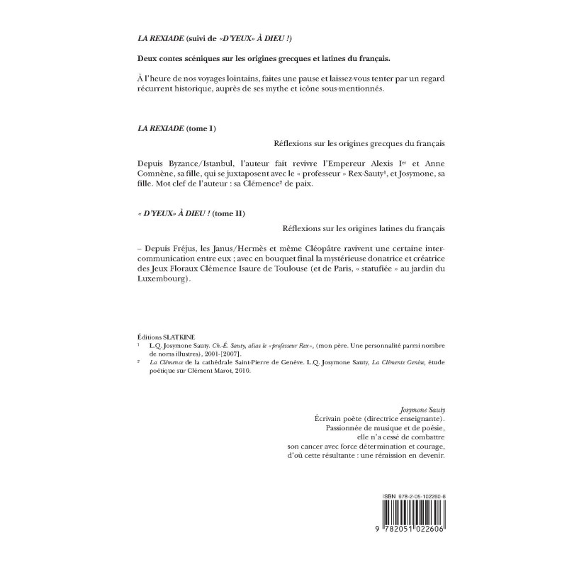 LA REXIADE (suivi de "D'YEUX" À DIEU !) : Deux contes scéniques sur les origines grecques et latines du français. À l'heure de nos voyages lointains, faites une pause et laissez-vous tenter par un regard récurrent historique, purement classique, auprès de ses mythe et icône sous-mentionnés. LA REXIADE (tome I) : Réflexions sur les origines grecques du français. Depuis Byzance/Istanbul, l'auteur fait revivre l'Empereur Alexis Ier et Anne Comnène ,sa fille, qui se juxtaposent avec le " professeur " Rex-Sauty1, et Josymone, sa fille. Mot clef de l'auteur : sa Clémence2 de paix." D'YEUX" À DIEU ! (tome II) : Réflexions sur les origines grecques du français - Depuis Fréjus, les Janus/Hermès et même Cléopâtre ravivent une certaine intercommunication entre eux ; avec pour bouquet final la mystérieuse donatrice et créatrice des Jeux Floraux Clémence Isaure de Toulouse (et de Paris, " statufiée " au jardin du Luxembourg). JOSYMONE SAUTY : Écrivain poète (directrice enseignante). Passionnée de musique et de poésie, elle n'a cessé de combattre son cancer avec force détermination et courage, d'où cette résultante : une rémission en devenir.