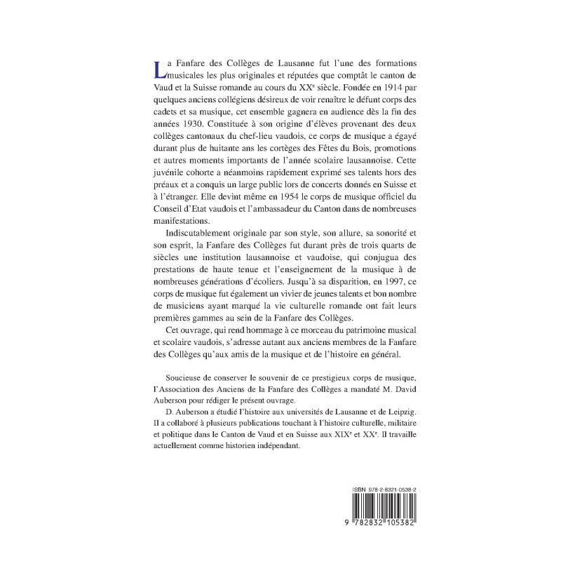 Soucieuse de conserver le souvenir de ce prestigieux corps de musique, l’Association des Anciens de la Fanfare des Collèges a mandaté M. David Auberson pour rédiger le présent ouvrage. Il a collaboré à plusieurs publications touchant à l’histoire culturelle, militaire et politique au XIXe et XXe. Il travaille actuellement comme historien indépendant.