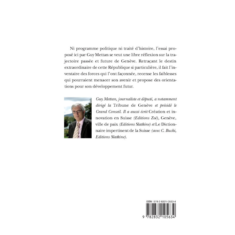 Ni programme politique ni traité d’histoire, l’essai proposé ici par Guy Mettan se veut une libre réflexion sur la trajectoire passée et future de Genève. Retraçant le destin extraordinaire de cette République si particulière, il fait l’inventaire des forces qui l’ont façonnée, recense les faiblesses qui pourraient menacer son avenir et propose des orientations pour son développement futur.