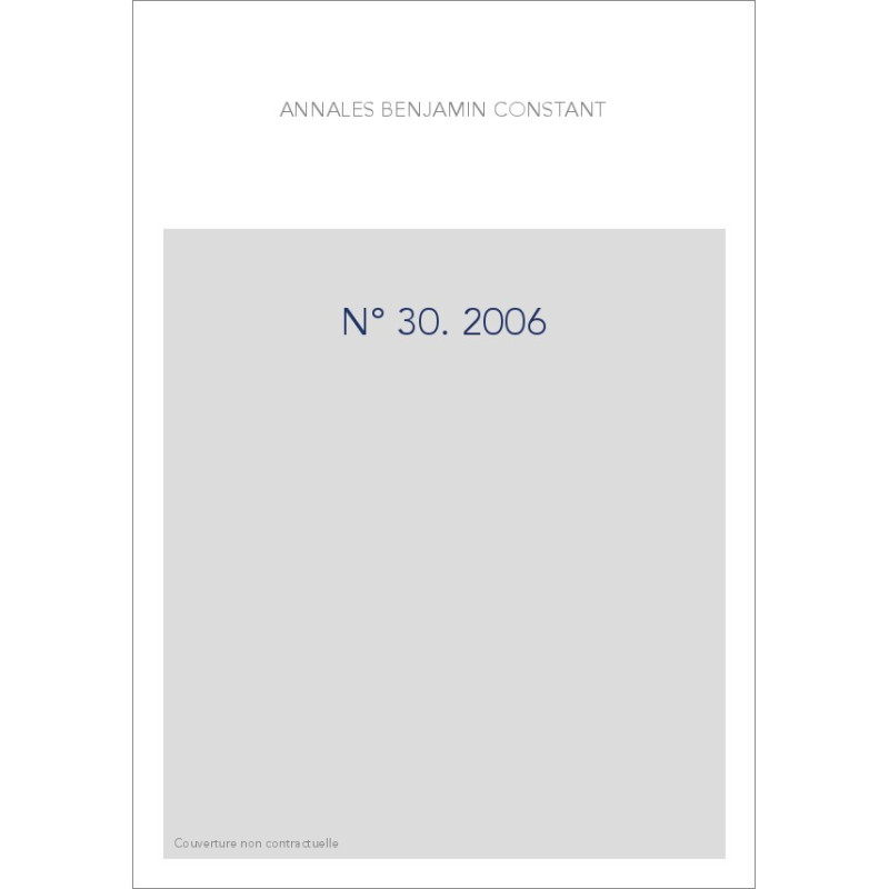 BENJAMIN CONSTANT ET LE GROUPE DE COPPET. Jean-Marie Roulin, Florestan, ou le Siège de Soissons : le tyran, la fée et le nain ; Kurt Kloocke, Le projet d'édition de Florestan de Gustave Rudler ; Antonio Trampus, Filangieri et Constant : constitutionnalisme des Lumières et constitutionnalisme libéral ; Denis Thouard, Subjectivité et sentiment religieux : Constant et Schleiermacher. ŒUVRES COMPLÈTES DE BENJAMIN CONSTANT. Œuvres complètes : volumes parus et à paraître ; Paul Delbouille, Réflexions nouvelles sur la rédaction d'Adolphe et de Cécile. L'ÉMIGRATION EN SUISSE (1789-1798) : ÉVÉNEMENTS, RÉCITS, REPRÉSENTATIONS. Claire Jaquier, Introduction ; Danièle Tosato-Rigo, Isabelle de Charrière et le bonheur d'être suisse en 1797/1798 : un "procès" à réviser ; Valérie Cossy, Des romans pour un monde en mouvement. La Révolution et l'émigration dans l'œuvre d'Isabelle de Charrière ; Michèle Crogiez Labarthe, Malesherbes et les Suisses : de la réflexion juridique au jugement sur l'émigration ; Fabrice Brandli, Diplomatie, Révolution, émigration : la question des émigrés français dans la correspondance politique de la résidence de France à Genève (1789-1794) ; Claire Jaquier, Romans suisses de l'émigration, au croisement de l'histoire et de l'utopie sociale ; Jean-Daniel Candaux, Pour une géographie des imprimeurs de l'émigration et de la Contre-Révolution ; Comptes rendus.