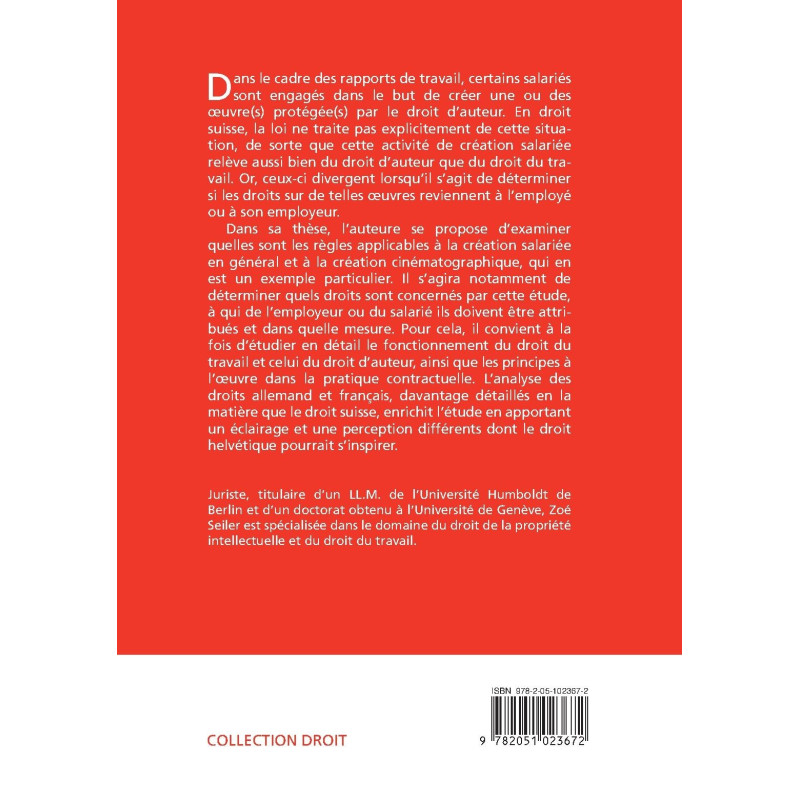 Dans le cadre des rapports de travail, certains salariés sont engagés dans le but de créer une ou des œuvre(s) protégée(s) par le droit d’auteur. En droit suisse, la loi ne traite pas explicitement de cette situation, de sorte que cette activité de création salariée relève aussi bien du droit d’auteur que du droit du travail. Or, ceux-ci divergent lorsqu’il s’agit de déterminer si les droits sur de telles œuvres reviennent à l’employé ou à son employeur. Dans sa thèse, l’auteure se propose d’examiner quelles sont les règles applicables à la création salariée en général et à la création cinématographique, qui en est un exemple particulier. Il s’agira notamment de déterminer quels droits sont concernés par cette étude, à qui de l’employeur ou du salarié ils doivent être attribués et dans quelle mesure. Pour cela, il convient à la fois d’étudier en détail le fonctionnement du droit du travail et celui du droit d’auteur, ainsi que les principes à l’œuvre dans la pratique contractuelle. L’analyse des droits allemand et français, davantage détaillés en la matière que le droit suisse, enrichit l’étude en apportant un éclairage et une perception différents dont le droit helvétique pourrait s’inspirer. Juriste, titulaire d’un LL.M. de l’Université Humboldt de Berlin et d’un doctorat obtenu à l’Université de Genève, Zoé Seiler est spécialisée dans le domaine du droit de la propriété intellectuelle et du droit du travail.