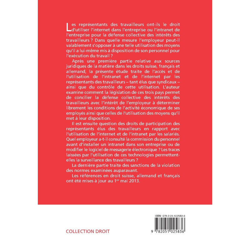 Après une première partie relative aux sources juridiques de la matière dans les droits suisse, français et allemand, la présente étude traite de l’accès et de l’utilisation de l’intranet et de l’internet par les représentants des travailleurs – tant élus que syndicaux – ainsi que du contrôle de cette utilisation. L’auteur examine comment la législation de ces trois pays permet de concilier la défense collective des intérêts des travailleurs avec l’intérêt de l’employeur à déterminer librement les conditions de l’activité économique de ses employés ainsi que celles de l’utilisation des moyens qu’il met à leur disposition.