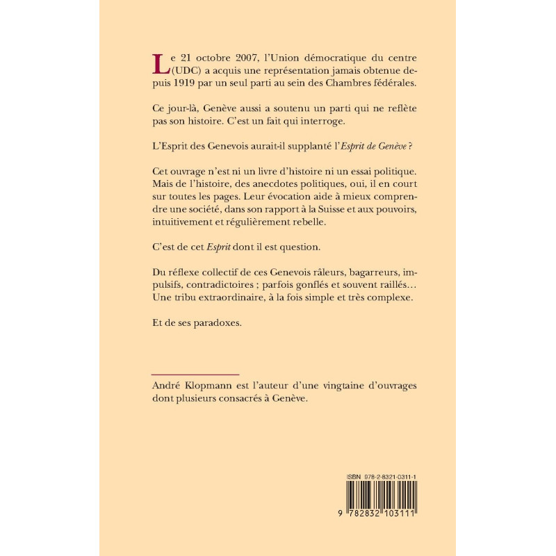Le 21 octobre 2007, l'Union démocratique du centre (UDC) a acquis une représentation jamais obtenue depuis 1919 par un seul parti au sein des Chambres fédérales. Ce jour-là , Genève aussi a soutenu un parti qui ne reflète pas son histoire. C'est un fait qui interroge. L'Esprit des Genevois aurait-il supplanté l'Esprit de Genève ? Cet ouvrage n'est ni un livre d'histoire ni un essai politique. Mais de l'histoire, des anecdotes politiques, oui, il en court sur toutes les pages. Leur évocation aide à mieux comprendre, dans son rapport à la Suisse et aux pouvoirs, une société intuitivement et régulièrement rebelle. C'est de cet Esprit dont il est question. Du réflexe collectif de ces Genevois râleurs, bagarreurs, impulsifs, contradictoires ; parfois gonflés et souvent raillés… Une tribu extraordinaire, à la fois simple et très complexe. Et de ses paradoxes.