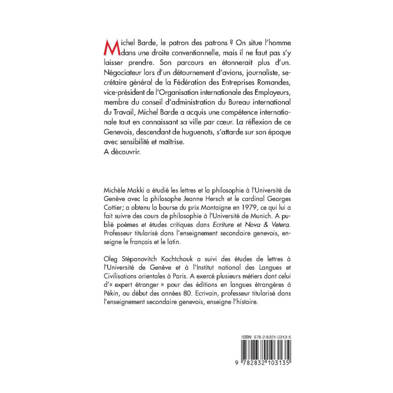 Michel Barde, le patron des patrons ? On situe l'homme dans une droite conventionnelle, mais il ne faut pas s'y laisser prendre. Son parcours en étonnerait plus d'un. Négociateur lors d'un détournement d'avions, journaliste, secrétaire général de la Fédération des Entreprises romandes, vice président de l'Organisation internationale des Employeurs, membre du conseil d'administration du Bureau international du Travail, Michel Barde a acquis une compétence internationale tout en connaissant sa ville par coeur. La réflexion de ce Genevois, descendant d'Huguenots, s'attarde sur son époque avec sensibilité et maîtrise. A découvrir.