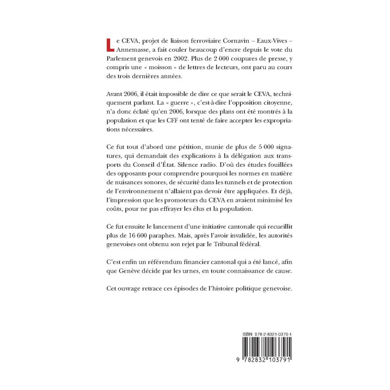Le CEVA, projet de liaison ferroviaire Cornavin - Eaux-Vives - Annemasse, a fait couler beaucoup d`encre depuis le vote du Parlement genevois en 2002. Plus de 2 000 coupures de presse, y compris une " moisson " de lettres de lecteurs, ont paru au cours des trois dernières années. Avant 2006, il était impossible de dire ce que serait le CEVA, techniquement parlant. La " guerre ", c`est-à -dire l`opposition citoyenne, n`a donc éclaté qu`en 2006, lorsque des plans ont été montrés à la population et que les CFF ont tenté de faire accepter les expropriations nécessaires. Ce fut tout d`abord une pétition, munie de plus de 5 000 signatures, qui demandait des explications à la délégation aux transports du Conseil d`État. Silence radio. D`où des études fouillées des opposants pour comprendre pourquoi les normes en matière de nuisances sonores, de sécurité dans les tunnels et de protection de l`environnement n`allaient pas devoir être appliquées. Et déjà , l`impression que les promoteurs du CEVA en avaient minimisé les coûts, pour ne pas effrayer les élus et la population. Ce fut ensuite le lancement d`une initiative cantonale qui recueillit plus de 16 600 paraphes. Mais, après l`avoir invalidée, les autorités genevoises ont obtenu son rejet par le Tribunal fédéral. C`est enfin un référendum financier cantonal qui a été lancé, afin que Genève décide par les urnes, en toute connaissance de cause. Cet ouvrage retrace ces épisodes de l`histoire politique genevoise.