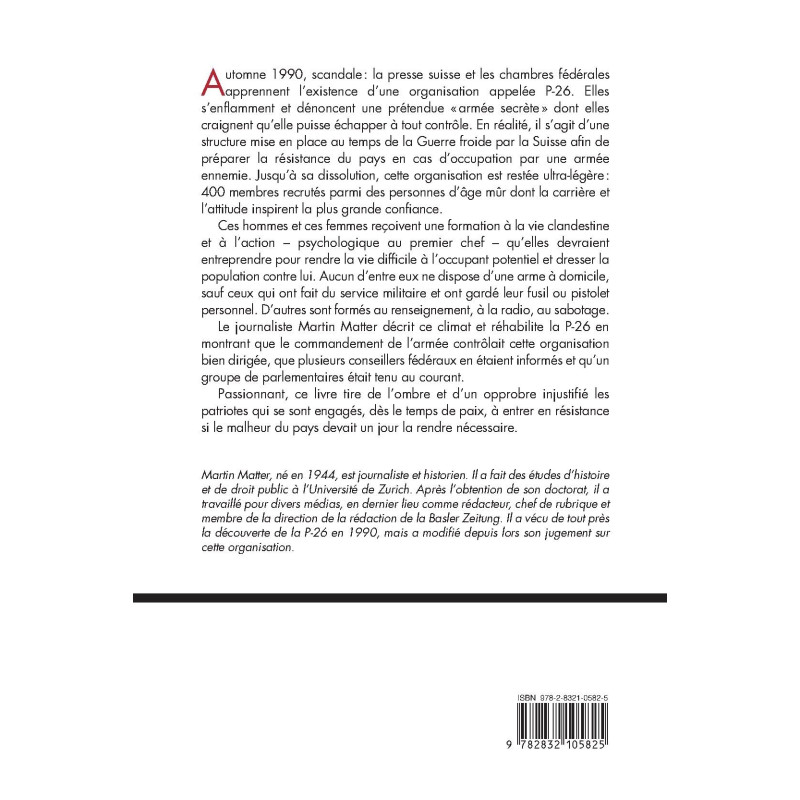 Automne 1990, scandale: la presse suisse et les chambres fédérales apprennent l’existence d’une organisation appelée P-26. Elles s’enflamment et dénoncent une prétendue «armée secrète» dont elles craignent qu’elle puisse échapper à tout contrôle. En réalité, il s’agit d’une structure mise en place au temps de la Guerre froide par la Suisse afin de préparer la résistance du pays en cas d’occupation par une armée ennemie. Jusqu’à sa dissolution, cette organisation est restée ultralégère: 400 membres recrutés parmi des personnes d’âge mûr dont la carrière et l’attitude inspirent la plus grande confiance. Ces hommes et ces femmes reçoivent une formation à la vie clandestine et à l’action – psychologique au premier chef – qu’elles devraient entreprendre pour rendre la vie difficile à l’occupant potentiel et dresser la population contre lui. Aucun d’entre eux ne dispose d’une arme à domicile, sauf ceux qui ont fait du service militaire et ont gardé leur fusil ou pistolet personnel. D’autres sont formés au renseignement, à la radio, au sabotage. Le journaliste Martin Matter décrit ce climat et réhabilite la P-26 en montrant que le commandement de l’armée contrôlait cette organisation bien dirigée, que plusieurs conseillers fédéraux en étaient informés et qu’un groupe de parlementaires étaient tenus au courant. Passionnant, ce livre tire de l’ombre et d’un opprobre injustifié les patriotes qui se sont engagés, dès le temps de paix, à entrer en résistance si le malheur du pays devait un jour la rendre nécessaire.