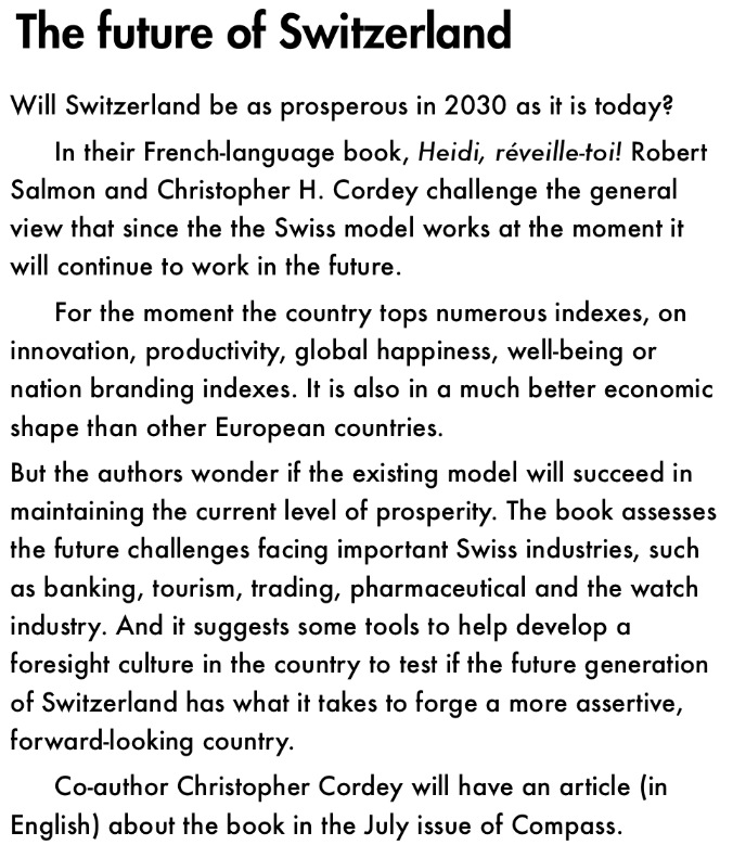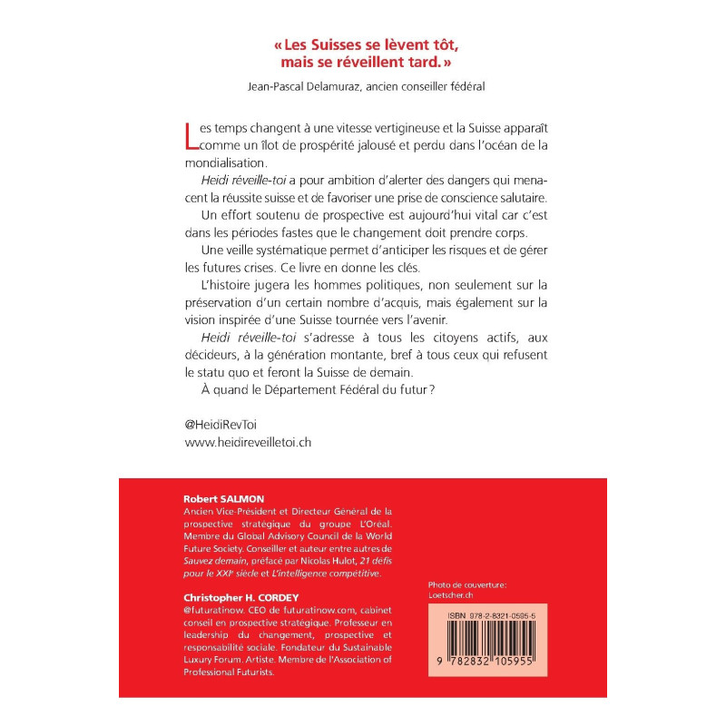 Les temps changent à une vitesse vertigineuse et la Suisse apparaît comme un îlot de prospérité jalousé et perdu dans l’océan de la mondialisation. Heidi réveille-toi a pour ambition d’alerter des dangers qui menacent la réussite suisse et de favoriser une prise de conscience salutaire. Un effort soutenu de prospective est aujourd’hui vital car c’est dans les périodes fastes que le changement doit prendre corps. Une veille systématique permet d’anticiper les risques et de gérer les futures crises. Ce livre en donne les clés. L’histoire jugera les hommes politiques, non seulement sur la préservation d’un certain nombre d’acquis, mais également sur la vision inspirée d’une Suisse tournée vers l’avenir. Heidi réveille-toi s’adresse à tous les citoyens actifs, aux décideurs, à la génération montante, bref à tous ceux qui refusent le statu quo et feront la Suisse de demain.