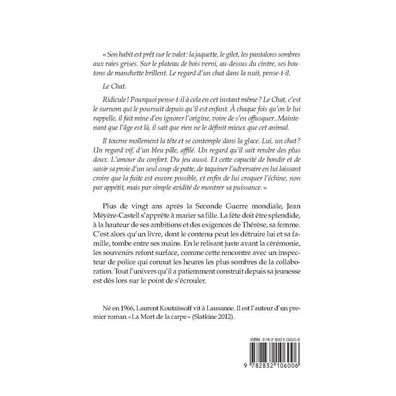 Ridicule! Pourquoi pense-t-il à cela en cet instant même? Le Chat, c’est le surnom qui le poursuit depuis qu’il est enfant. À chaque fois qu’on le lui rappelle, il fait mine d’en ignorer l’origine, voire de s’en offusquer. Maintenant que l’âge est là, il sait que rien ne le définit mieux que cet animal. Il tourne mollement la tête et se contemple dans la glace. Lui, un chat?
