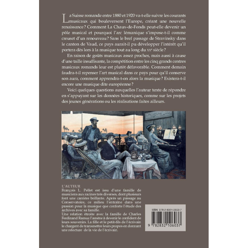 La Suisse romande entre 1880 et 1920 va-t-elle suivre les courants musicaux qui bouleversent l’Europe, créant une nouvelle renaissance? Comment La Chaux-de-Fonds peut- elle devenir un pôle musical et pourquoi l’arc lémanique s’impose-t-il comme creuset d’un renouveau? Sans le bref passage de Strawinsky dans le canton de Vaud, ce pays aurait-il pu développer l’intérêt qu’il portera dès lors à la musique tout au long du XXe siècle? En raison de goûts musicaux assez proches, mais aussi à cause d’une taille insuffisante, la compétition entre les cinq grands centres musicaux romands leur est plutôt défavorable. Comment demain faudra-t-il repenser l’art musical dans ce pays pour qu’il conserve son aura, comment apprendra-t-on alors la musique? Existera-t-il encore une musique dite européenne? Voici quelques questions auxquelles l’auteur tente de répondre en s’appuyant sur les données historiques, comme sur les projets des jeunes générations ou les réalisations faites ailleurs.