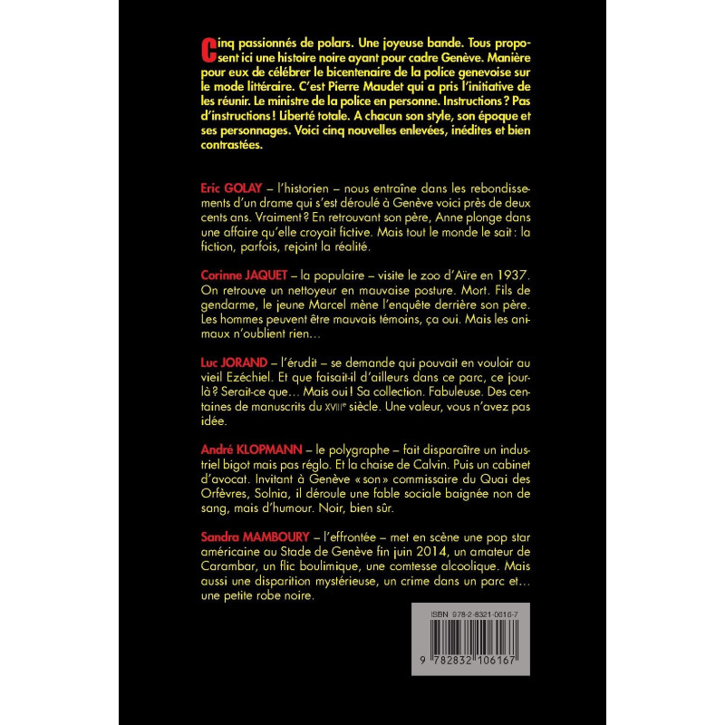Cinq passionnés de polars. Une joyeuse bande. Tous proposent ici une histoire noire ayant pour cadre Genève. Manière pour eux de célébrer le bicentenaire de la police genevoise sur le mode littéraire. C’est Pierre Maudet qui a pris l’initiative de les réunir. Le ministre de la police en personne. Instructions? Pas d’instructions ! Liberté totale. A chacun son style, son époque et ses personnages. Voici cinq nouvelles enlevées, inédites et bien contrastées.
